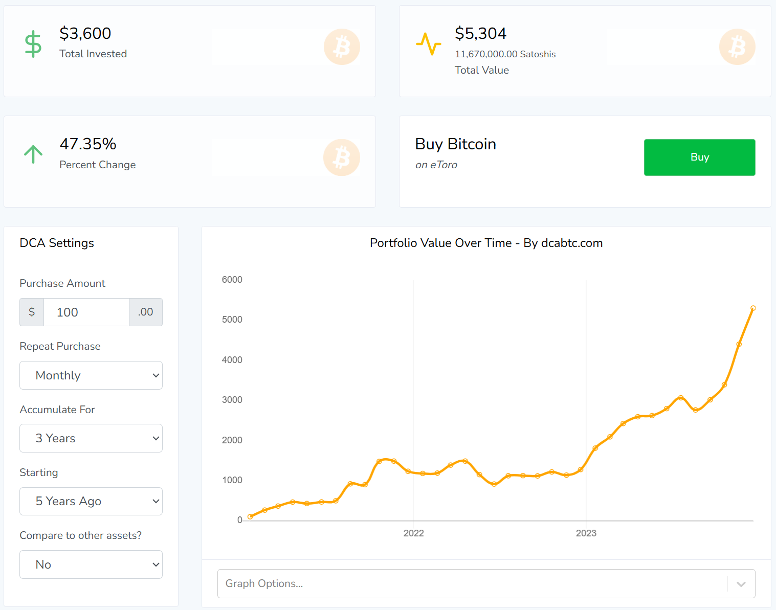 Stratégia DCA (dollar-cost averaging) je jedným z vhodných spôsobov ako postupne investovať do tejto kryptomeny. Na základe údajov, ktoré zadáte pri vašej stratégii, sa dá simulovať postupný nárast hodnoty v dolároch. Na webe dcabtc.com si to môžete vyskúšať sami.