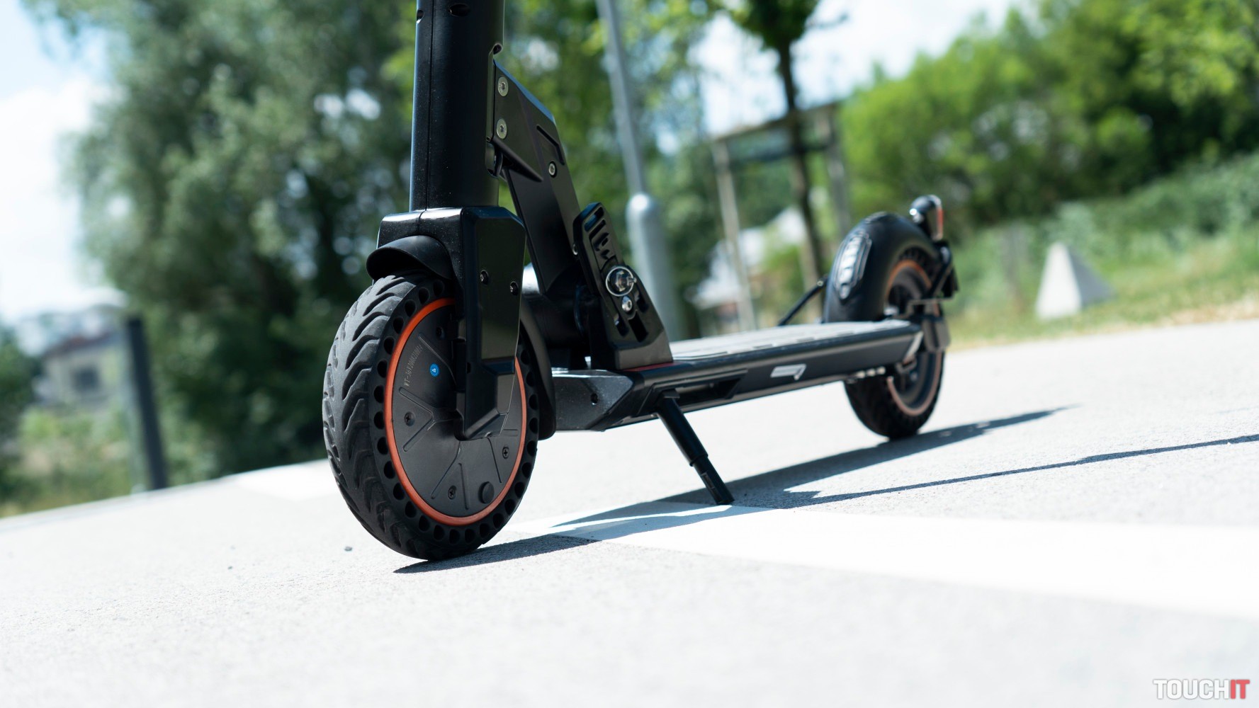 Výhodou tejto kolobežky je účinné odpruženie. Konkrétne sú tu vzduchom plnené bezdušové pneumatiky a disky s priemerom 8,5 palca. ďalej je tu pruživé odpruženie zadného kolesa a pružinu nájdete aj vpredu. Jazdiť sa dá aj do kopca, pri našej váhe cez 100 km sme jej mierne pomáhali jednou nohou. Hmotnosť celej kolobežky je 15 kg, čo je istá hmotnosť s ktorou si ale dospelý človek poradí napr. aj pri nastupovaní do vlaku alebo do električky.