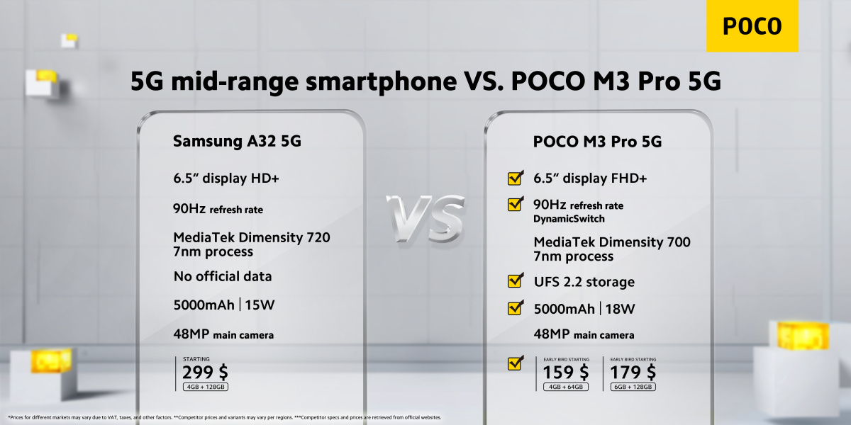 Novinka prináša špičkovú výbavu v cene do 200 eur a 5G čipset MediaTek Dimensity 700. Telefón má 6,5“ Full HD+ displej s kruhovým výrezom a variabilnou frekvenciou s maximom až na 90 Hz. Prepínanie režimov je automatické, no o výdrž batérie sa netreba obávať. Je tu 5000 mAh batéria s nabíjaním. Batéria sa dá nabíjať s výkonom 18 W, no v balení je 22,5 W nabíjačka. Výbava fotoaparátov obsahuje 48 Mpx hlavný snímač, makro objektív a snímač hĺbky. Smartfón má všetko podstatné, teda IR port, audio konektor a tiež NFC. Telefón teda využijete aj na platenie v obchode. Svojou výbavou je silná konkurencia medzi telefónmi v tejto cenovej hladine. Ak by aj mali podobnú výbavu, nebudú ešte na rozdiel od verzie POMO M3 Pro pripravené na najnovšie 5G siete. Ak už by mali iné smartfóny za túto cenu 5G modul, výrobca určite zníži ich ostatné parametre, či už pri displeji alebo procesore. Prečítajte si aj:POCO M3 Pro 5G: Zatiaľ najlepšia výbava a cena za 5G telefón