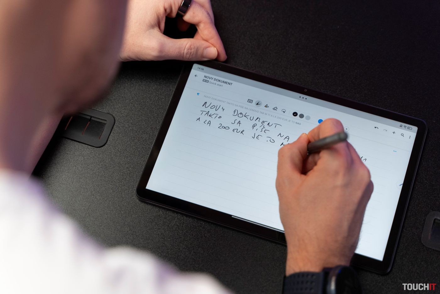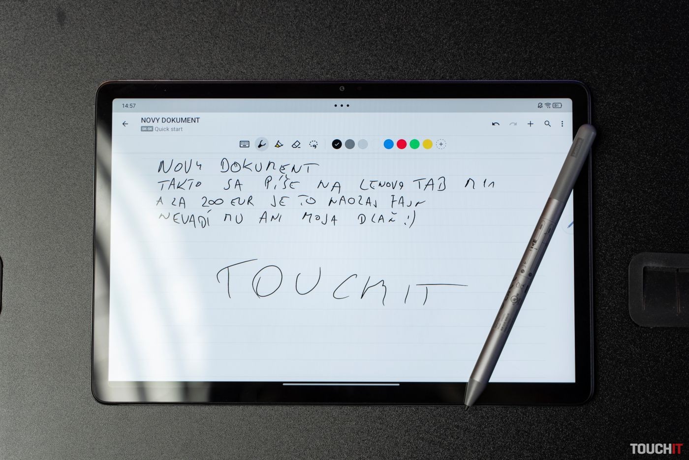 Na skicovanie, kreslenie, písanie poznámok či anotovanie je tento tablet výborný a na tento účel odporúčam využiť predinštalovanú aplikáciu Nebo. Tá vám prepíše rukou písaný text a podporuje aj slovenčinu. Funkcie na prepis s podporou slovenčiny však môžete využívať v rámci celého systému. Stačí si ich zapnúť v nastaveniach pera v rámci nastavení systému Android.