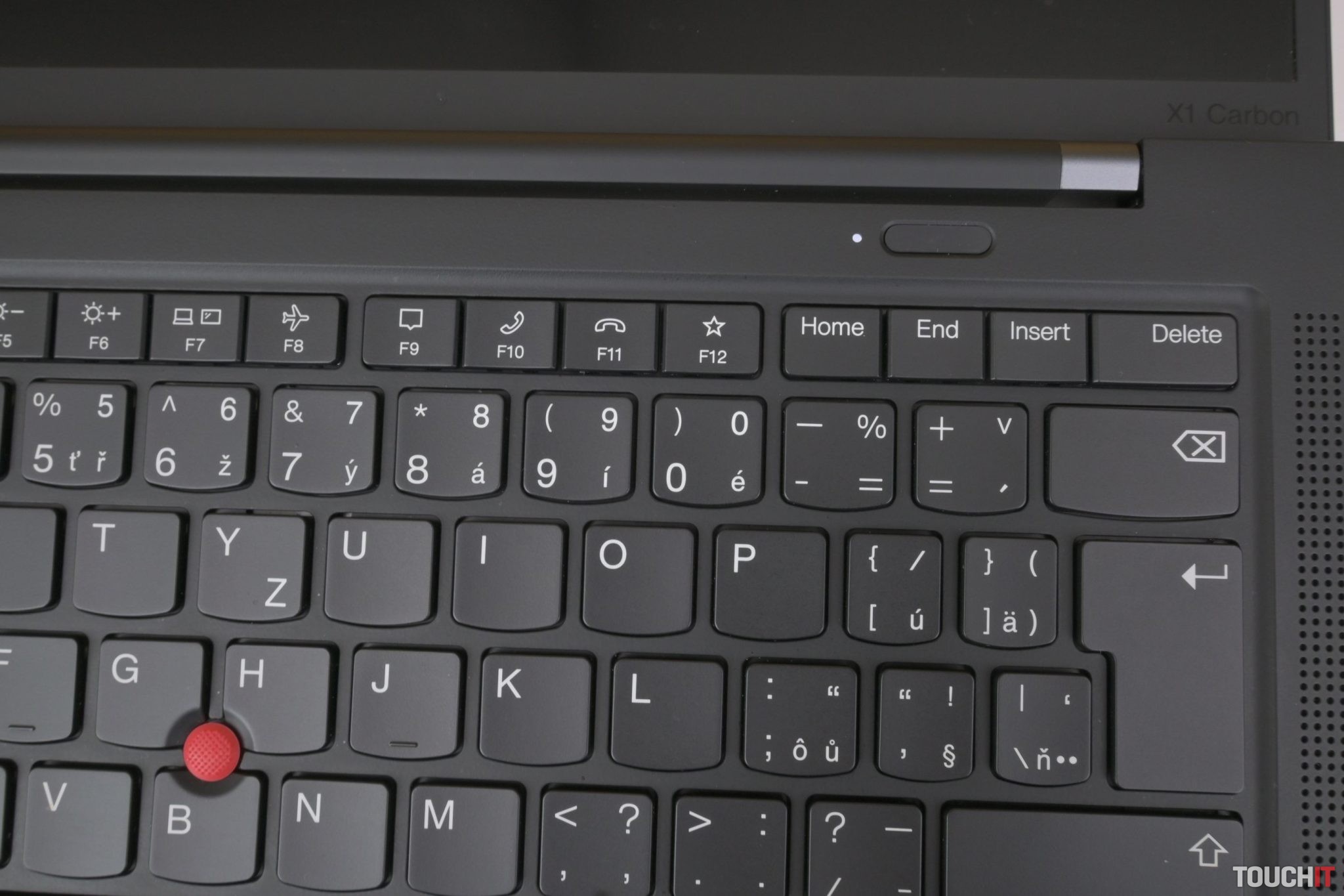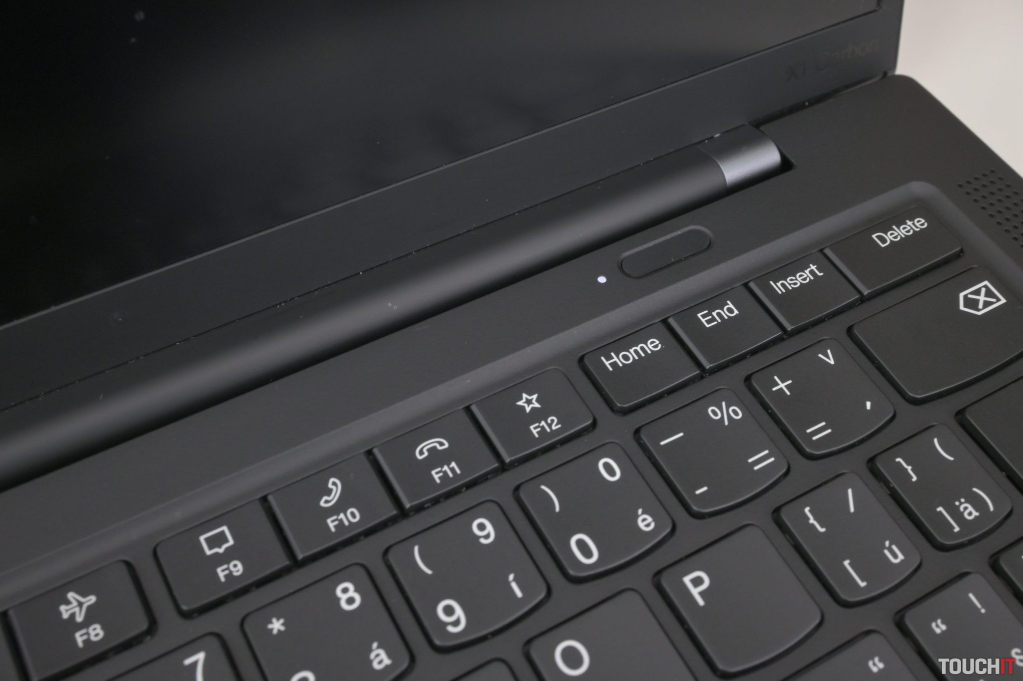 Tlačidlo na zapnutie notebooku je oddelené a ide o úzky prvok nad klávesnicou. Jeho súčasťou je snímač odtlačkov, avšak do systému sa dá prihlásiť aj cez infračervenú kameru. Dá sa zakryť mechanickým krytom.