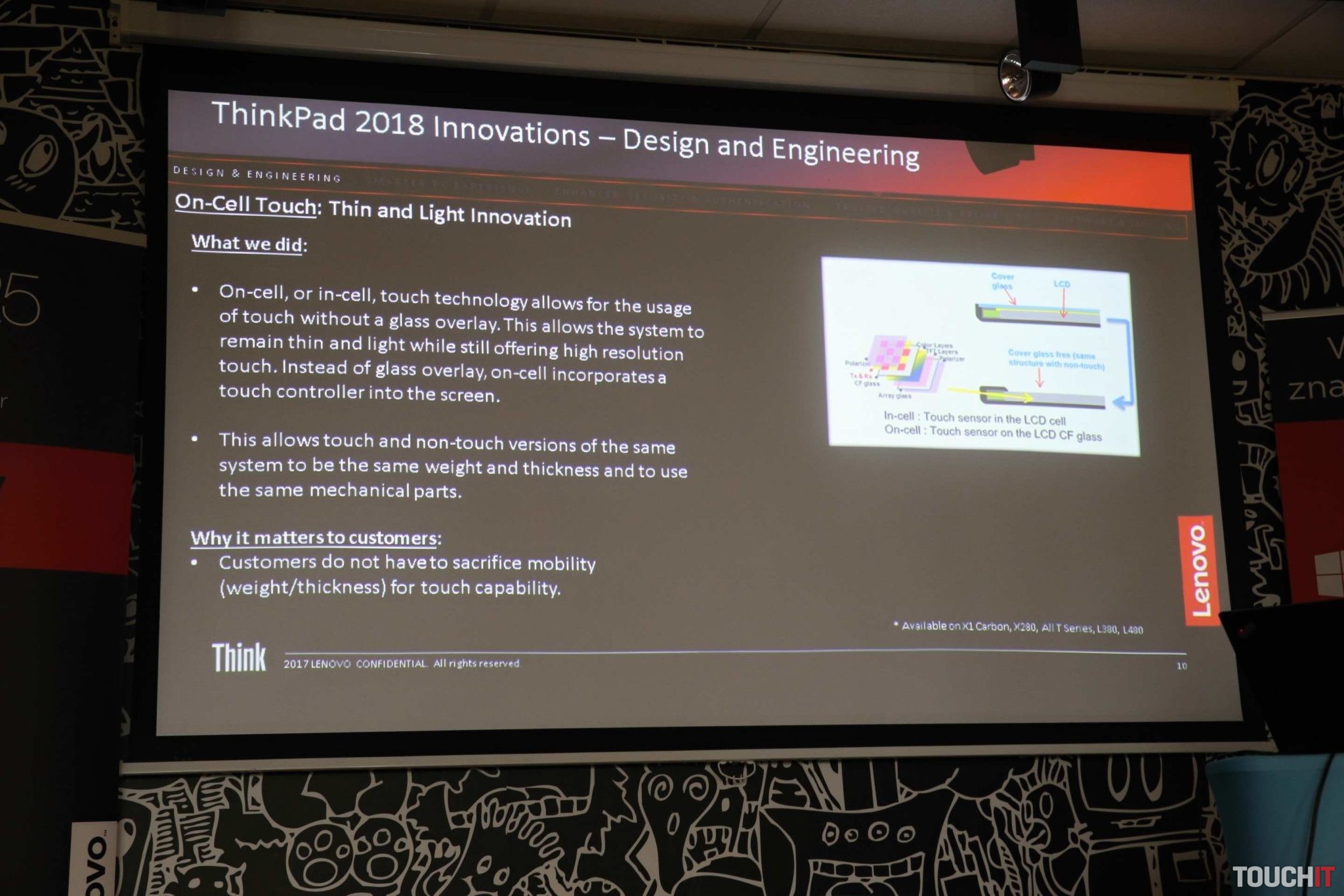 Špecialitou je matný displej, ktorý ja zároveň dotykový. Dotyková vrstva je totiž v zobrazovacej vrstve. Vďaka tomu sa podarilo dosiahnuť rovnakú hrúbku ako pri nedotykových verziách. Verzie Yoga majú Gorilla Glass a výrobca tam stále používa sklo. Je to obrana pri používaní dotykového pera a zároveň a v prípade pádu notebooku.