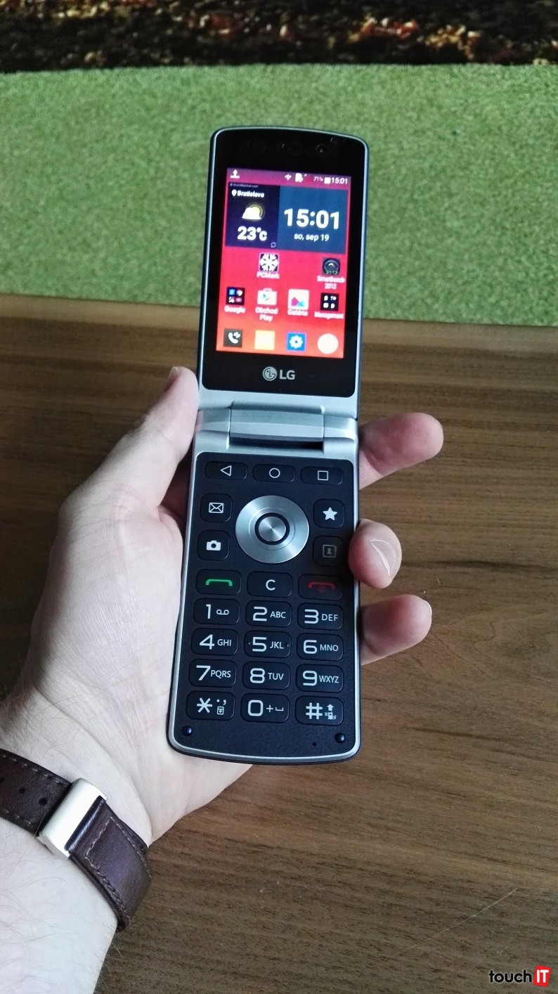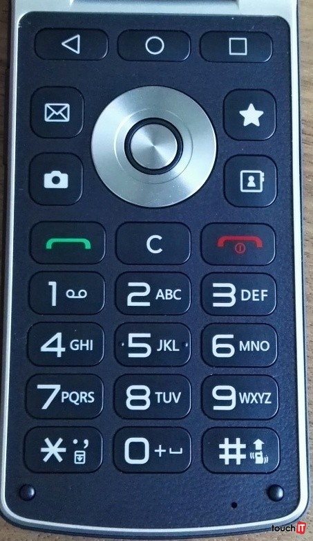 Displej tu je len jeden, takže nie je použitý koncept druhého zmenšeného povedzme informačného displeja na zobrazovanie notifikácií. Na hlavnej ploche po odklopení nájdete hardvérové tlačidlá. Prvý rad je určený tlačidlám na ovládanie systému Android. Nechýba kruhový ovládač so štyrmi tlačidlami na „svetových“ stranách. Okolo sú tlačidlá na rýchly prístup k správam, fotoaparátu, kontaktom a spustenie obľúbenej aplikácie. Ak používate najčastejšie browser, môžete si ten váš nainštalovaný prednastaviť na toto tlačidlo. Nechýbajú klasické tlačidlá na hovory a numerická klávesnica. Tá je povedzme kameňom úrazu, no chápeme, že vtesnať QWERTY blok by bolo mierne nereálne. Ak aj reálne tak, by sa prakticky nedal pre svoju veľkosť používať.