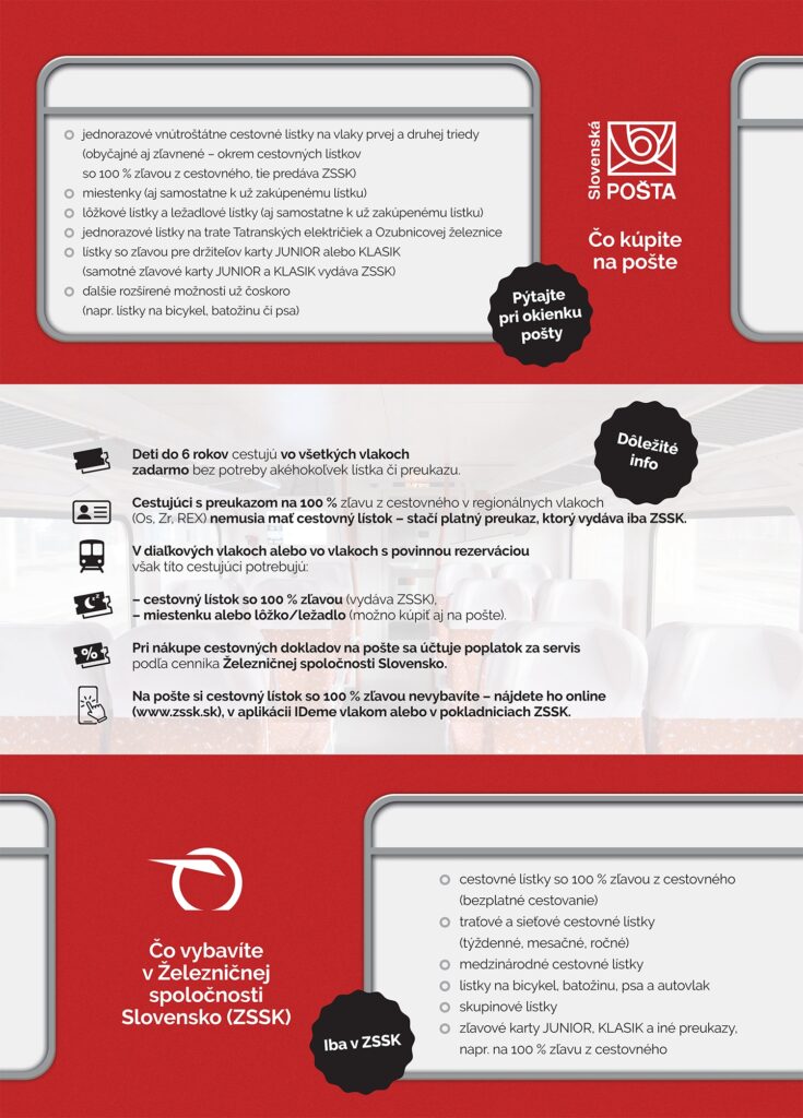 Na poštách sa účtuje servisný poplatok podľa cenníka ZSSK. Lístky so 100 % zľavou a medzinárodné spoje zostávajú naďalej dostupné len cez ZSSK.