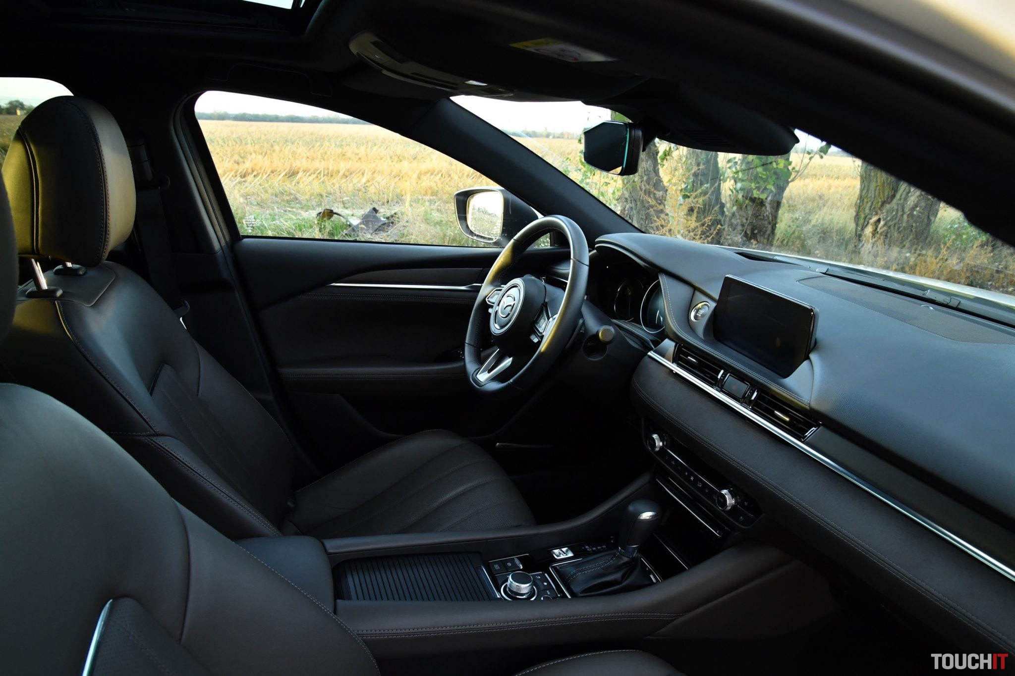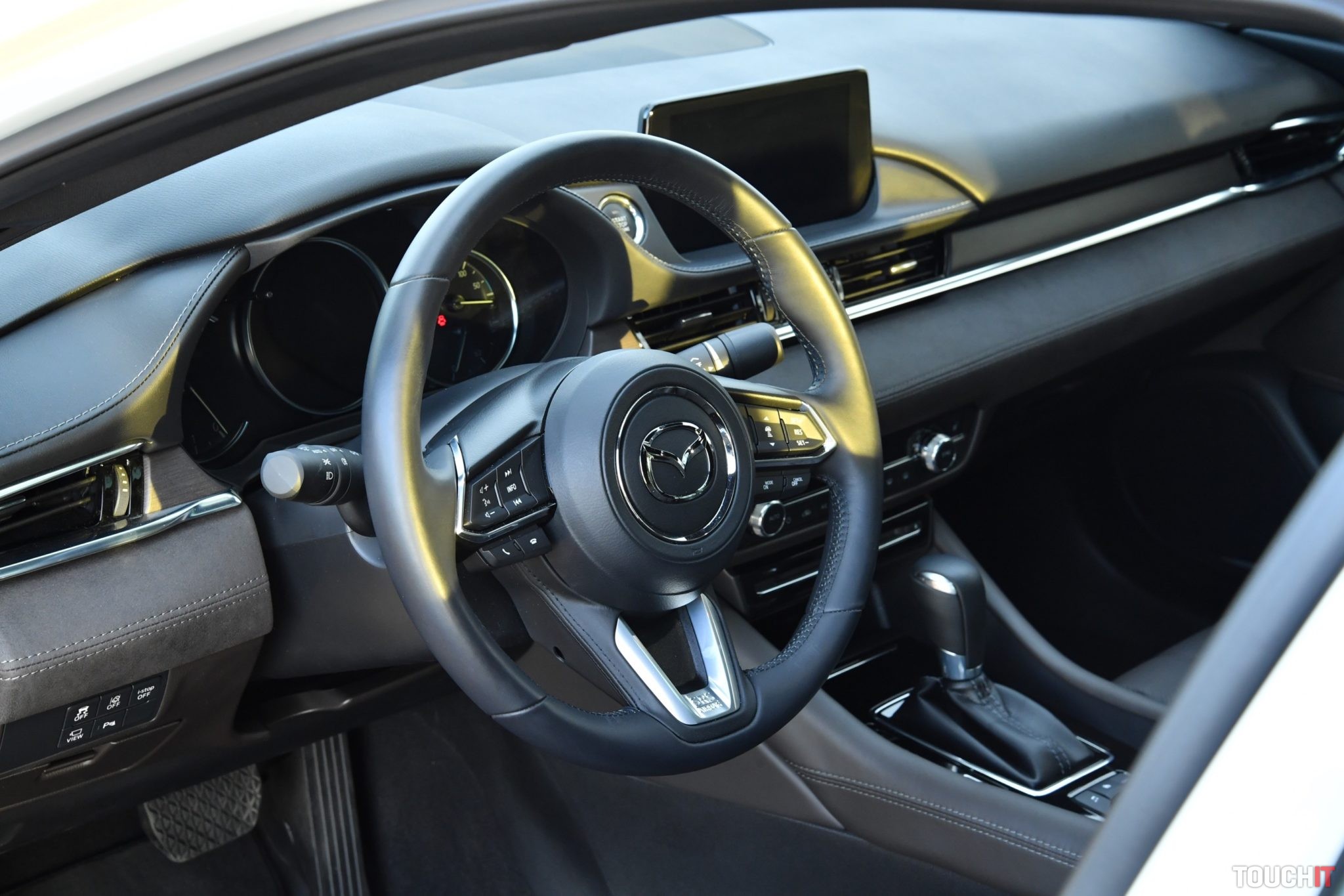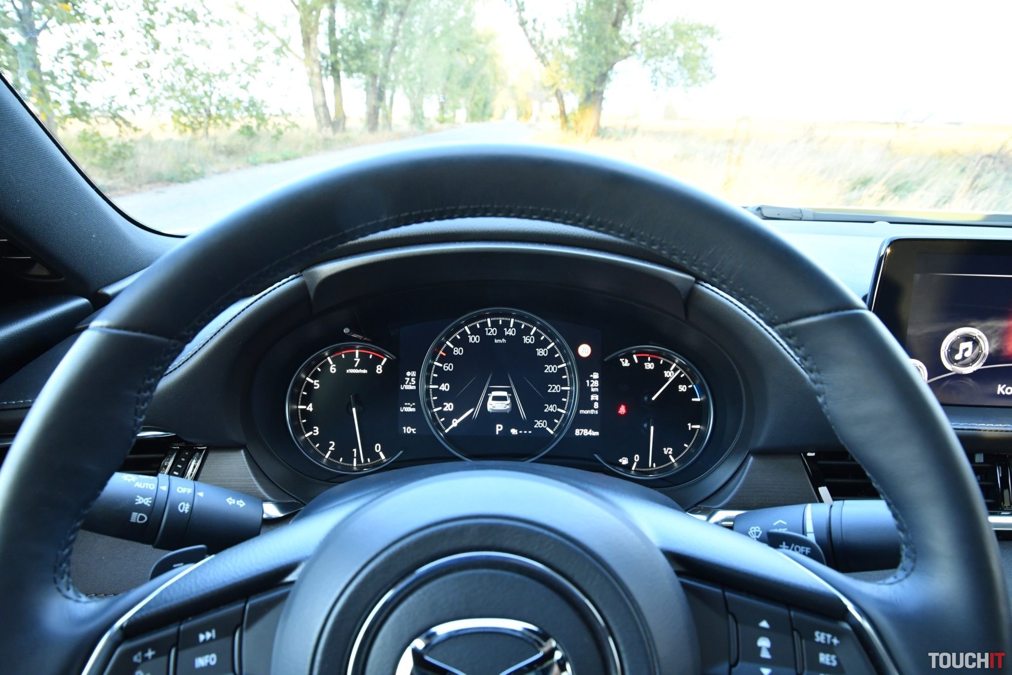 Centrom nastavení a útočiskom multimédií je systém MZD Connect, ktorý sa ovláda cez veľký 8“ dotykový LCD displej v strede palubnej dosky. Taktiež sa ovláda aj pomocou ovládacích prvkov v stredovej konzole (kruhový ovládač + tlačidlá rýchleho prístupu k dôležitým funkciám). Hlavnému displeju sekunduje 7“ digitálny prístrojový panel pred vodičom, ktorý je obklopený analógovými ukazovateľmi. Celé zobrazenie je veľmi prehľadné, ale ovládanie systému cez združený prístrojový panel (ovládanie na volante) je „v plienkach“. Zobraziť sa toho dá relatívne dosť, čo je výhoda, ale nastaviť takmer nič.