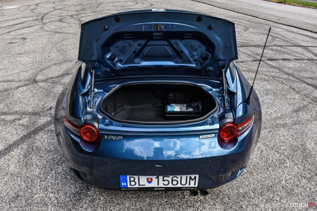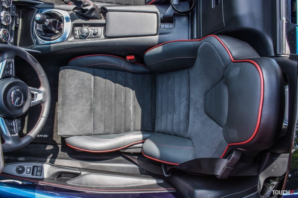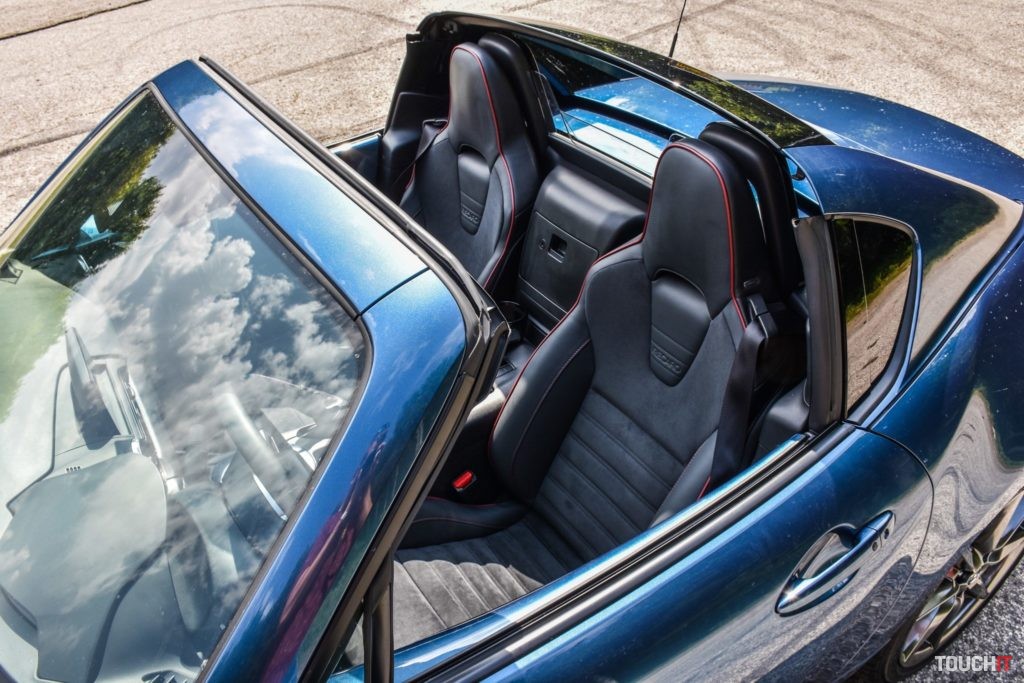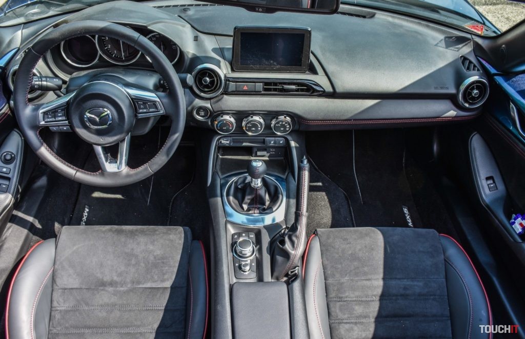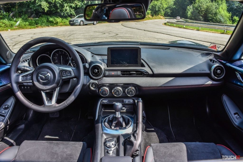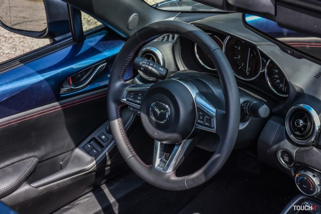 Čo robí auto? Kolesá! V tomto prípade pekné 17“ disky so zakrútenými lúčmi. Ešte pár slov k streche, ktorá je pevná, zaberá značnú plochu zadnej časti a jej otváranie/zatváranie je max. efektné. Zdvíha sa takmer celá zadná časť, v ktorej je ukrytá strecha. Po otvorení strechy sa vysunie aj plastový štít hneď za sedadlami, aby bolo optimalizované prúdenie vzduchu. Elektrické otváranie/zatváranie strechy trvá 13 až 15 sekúnd. Nevýhodou je, že tento proces urobíte iba vtedy, ak ide auto max. 10 km/h, čo je strašne málo. Ak si veľký, tak sa iba pozeraj – interiér pre 2 osoby Interiér Mazdy MX-5 je jednoduchý, minimalistický a dobre usporiadaný. Nevýhodou (pre mňa) je iba to, že ide o strašne malé auto, a tak je pochopiteľne aj životný priestor obmedzený. Testovaný model mal výborné športové sedadlá značky RECARO, ktoré sú manuálne nastaviteľné v základom rozsahu + sú vyhrievané. Ja meriam 2 metre, takže možnosť nastavenia sa zúžila na minimum a môj chrbát cítil každú časť sedadla. Jednoducho to je auto pre menšie osoby, skúšali si sem sadnúť viacerí ľudia, pričom som sa utvrdil, že ideálne je to do max. 180 cm. Ak máte viac, tak smola – hlava vám bude trošku trčať von, čo je smiešne a ešte aj nebezpečné. Po zavretí strechy som sa musel poskladať ešte viac a krk dať o 10° doprava, aby som bol v „pohode“. Každopádne musím príplatkové športové sedadlá pochváliť, nakoľko sú kvalitne spracované a majú optimálne bočné vedenie s integrovanou hlavovou opierkou.