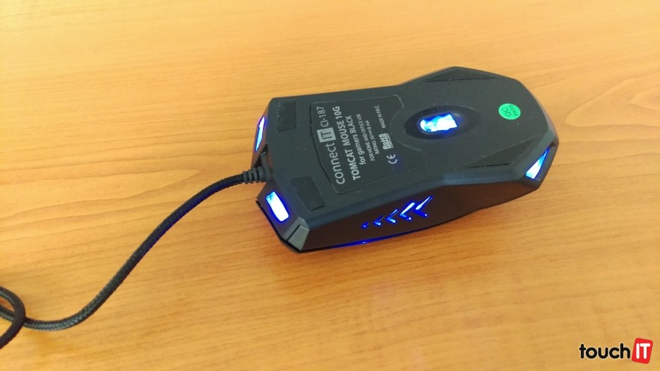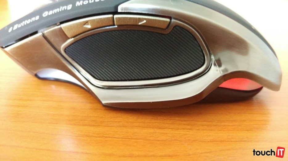 Myš tohto typu je viac prepracovaná a najmä si ponecháva svoj predĺžený tvar a rozšírenie prednej časti. To sa nám páčilo, rovnako tak aj modré svetlá na okrajoch zadnej a prednej strany. Ergonómia myši by mohla byť lepšia, než za akú ju vydáva výrobca. Faktom je, že tvar je prispôsobený na pohodlné držanie ale vo výsledku sú styčné hrany mierne ostré. Na pohľad to tak nevyzerá, na dotyk to už cítite. Ocenili sme, že zmena dpi je signalizovaná LED diódami na chrbte. Celkovo štyri rôzne stupne rozlíšenia 800 / 1200 / 1600 / 2400 dpi môžete meniť červeným tlačidlom na hornej strane a podľa toho sa bude meniť aj počet rozsvietených LED diód. Úchop pre palec je pogumovaný. Myš môžete teda ovládať aj ľavou rukou, no vzhľadom na umiestnenie tlačidiel vpred a vzad to nebude úplne ideálne riešenie. Stále ju však vnímame ako univerzálny model. Ak je pre vás cena citlivým parametrom, bude vedieť používať v ľavej ruke aj túto myš. Otázkou bude ale reakčná schopnosť pri hraní hier. Spomínané tlačidlá na boku sú červené a myš tak trochu pripomína niekdajší koncept IBM. To ale nie je tak podstatné ako príliš mäkký spínač pri týchto tlačidlách. Sú pružné takže až tak ľahko o ne nezavadíte, no sú príliš jemné. Podľa nás by chcelo trochu cviku používať túto myš ako kancelársku nieto ešte vo vypätých situáciách ako hernú. Na konci kábla je feritové jadro na tienenie elektromagnetického rušenia. Podložky sú kĺzavé a aj cez ich menšiu veľkosť sa myš dobre správa na nerovnom povrchu ako aj látkovom. Opäť prípad len v rámci úplných testov. Toto je myš, ktorú sa oplatí používať na podložke. Na lesklých povrchoch si viedla horšie, pohyb a presnosť sa zlepšila zvýšením dpi. Nedosiahli sme však adekvátnu reakčnú rýchlosť.