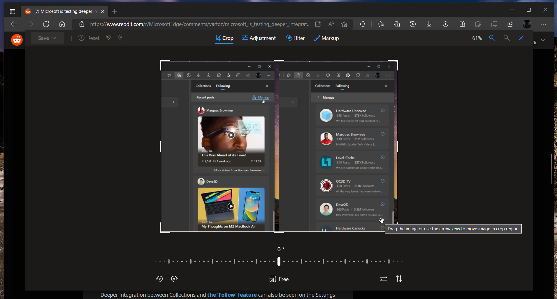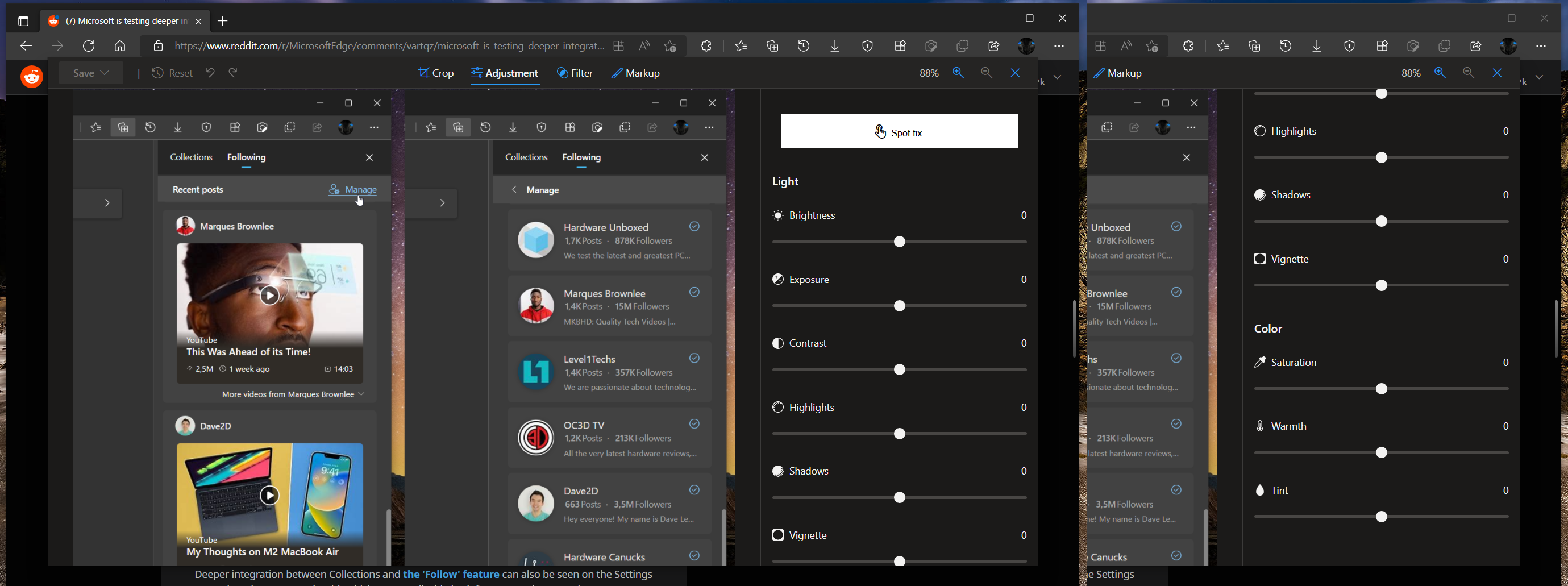 Zatiaľ ide o zostavu Edge Canary, nehľadajte túto funkciu v hlavnej verzii prehliadača. Dokonca ani v experimentálnej verzii nemajú túto možnosť dostupnú všetci používatelia. Obrázok sa dá upraviť kliknutím na položku v kontextovom menu po kliknutí na obrázok. Vizuál provizórneho editora sa podobá na prehliadač a editor fotografií v operačnom systéme. Toto si ale všimnú najviac používatelia tohto systému. Linuxoví používatelia prehliadača Edge túto podobnosť zbadať nemusia.