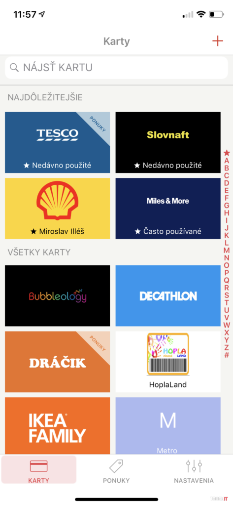 Výbornou funkciou sú aj ponuky, teda zoskupenie dostupných akciových a iných letákov od spoločností/obchodov, ktorých karty využívate. Môžu to byť aj zahraničné obchody a karty. Osobne tam mám Slovensko a Rakúsko. Ešte dodám, že ak chcete mať svoje vernostné karty zabezpečené, tak aplikácia ponúka samostatné uzamknutie kódom alebo biometrickými snímačmi (TouchID, FaceID a pod.).Výhodou je aj to, že sa do aplikácie môžete zaregistrovať a pod vašim kontom budú synchronizované všetky karty naprieč rôznymi zariadeniami. Nemusíte tak pridávať karty opätovne a aplikáciu pod jedným kontom môže používať celá rodina. To je fajn, nie?