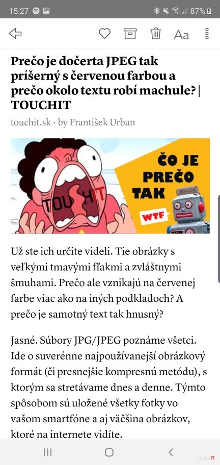 Služba Instapaper je výborná v tom, že vytiahne zo stránky len skutočný článok bez ďalších prvkov. Áno aj bez reklám, postranných nástrojov, líšt a ďalších prvkov na webovej stránke. Druhou výhodou je, že poskytne čítanie aj keď nemáte prístup na internet alebo ho máte a nechcete si míňať dáta surfovaním na webe. Články, ktoré ste si uložili do tejto služby máte stiahnuté do smartfónu a potom si ich môžete kedykoľvek prečítať. Výborná vec na nerušené čítanie, tiež pohodlnejšie ako na webe. Na tento účel sa dá použiť režim čítania v internetovom prehliadači. Takto ale máte samostatnú aplikáciu (službu), kde si články odošlete a omylom si ich nezmažete tak, ako by ste si povedzme nechávali otvorené karty v prehliadači. Celkovo je to jeden z najlepších spôsobov, ako čítať texty. Nechýbajú obrázky alebo vnorené videá. Tie sa ale nesťahujú a zapnú sa až po ťuknutí na displej. V aplikácii je na výber typ fontu, jeho veľkosť a farba podkladu. Môžete využiť čítanie na čiernom podklade s bielym písmom alebo si zapnúť sépiový podklad. Veľmi sa to podobá na čítačku elektronických kníh. Pre tých z vás, čo si chcete čítať na notebooku, je tu webová stránka www.instapaper.com. Po prihlásení na nej nájdete svoje články. Tu sa bude zobrazovať aj odhadovaný čas na dočítanie článku podľa toho, ako budete rolovať text na obrazovke. Aj toto je príklad, ako využiť konvertibilný notebook na čítanie dokumentov. V zvislom režime máte poriadny počet riadkov na čítanie vašich textov.