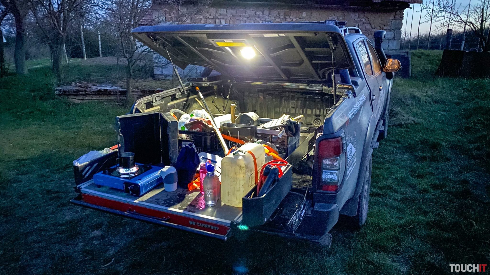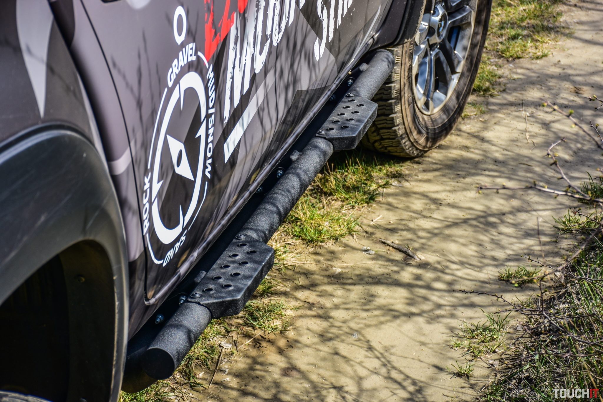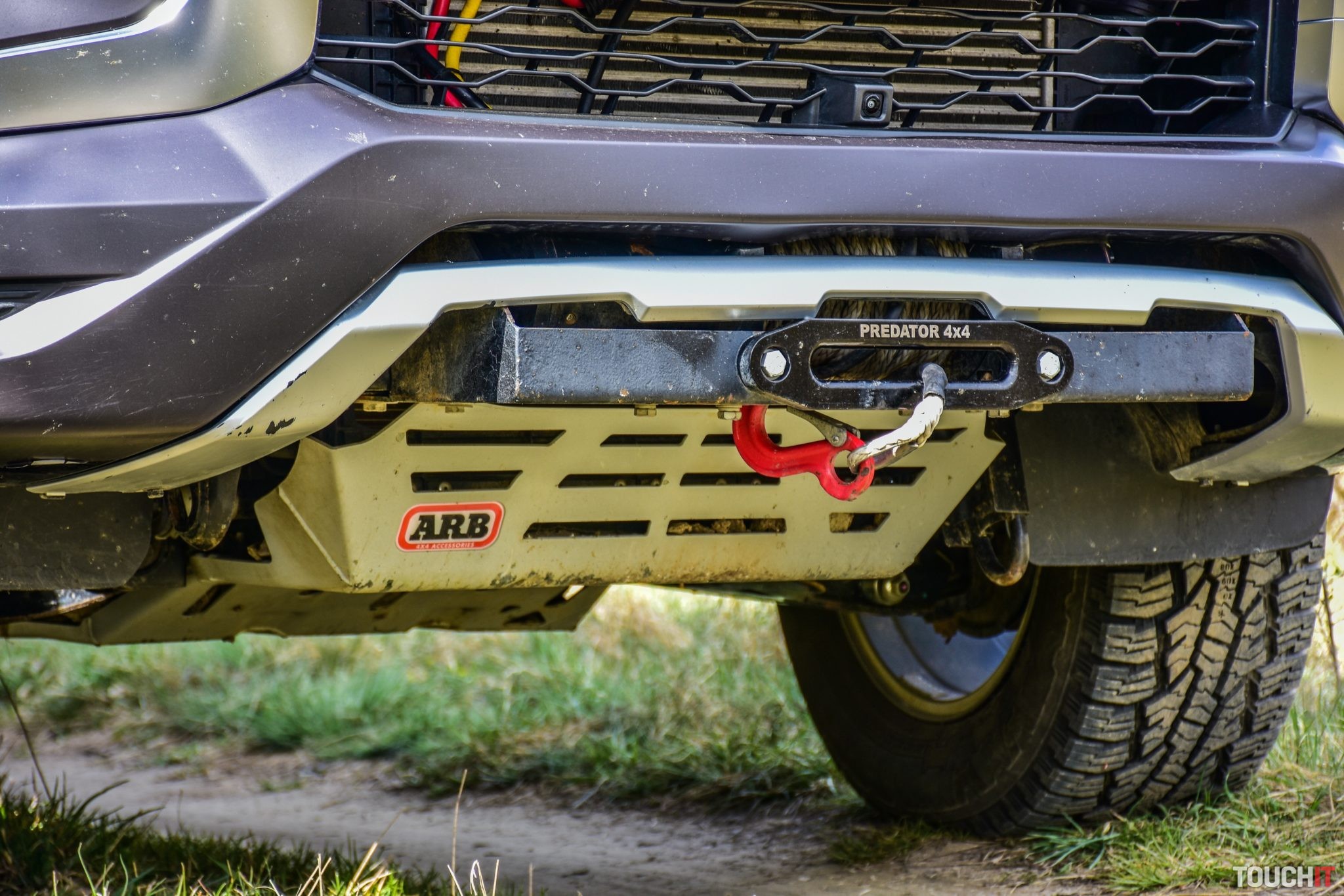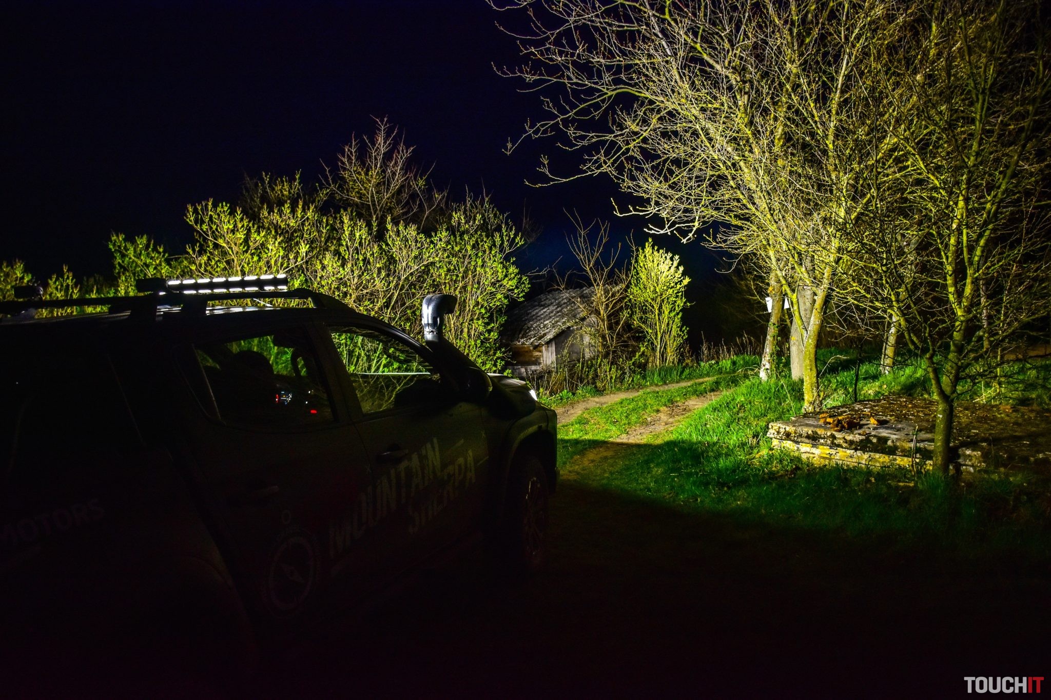 Základom je úprava resp. zvýšenie podvozku (+ 5 cm), čím sa zdvihla svetlá výška a tým aj priechodnosť. Použitý podvozok je od známej značky Oldman EMU. Stále však treba mať na pamäti, že ide o pick-up s dlhým rázvorom (3000 mm) i zadným previsom. V galérii nájdete fotku max. stúpania, ktoré je obmedzené práve zadným previsom s ochranným rámom, ktorý vám ušetrí stovky eur za odtrhnutý nárazník. Riešením by mohol byť aj kompaktnejší pevnostný nárazník. Výška tejto úpravy je značná, čo v teréne neraz oceníte a v meste sa cítite takmer ako v nákladom aute. Mám to rád! Veľmi dôležitým prvkom je aj kvalitná/pevná ochrana podvozku (motor, prevodovka, nádrž), v tomto prípade od spoločnosti ARB. Ak by táto súčasť chýbala, tak verím, že nie len ja, ale aj mnoho iných kolegov z branže by donieslo auto späť s nejakým poškodením. V teréne je tento prvok extrémne dôležitý. Ďalším viditeľným a rovnako praktickým prvkom sú robustné bočné ochranné rámy so stúpačkami, ktoré pomáhajú počas nastupovania, no hlavne chránia prahy vozidla pred poškodením. Ak narazíte prahom na skalu, tak to nemusí byť príjemné, tento rám zabezpečí, že to bude #safe a vo výsledku to vyzerá výborne. Kvôli vyššej brodivosti, resp. ochrane motora pred vniknutím vody cez prívod vzduchu (sanie) je prítomný aj Safari šnorchel, ktorý je okrem jeho funkčnej stránky aj znakom expedičných, resp. off-road vozidiel. Ak máte šnorchel, tak si musíte zvyknúť aj na špecifický zvuk sania a jemný hluk pri vyšších rýchlostiach. Osobne som jazdil aj po diaľnici a bolo to úplne v pohode. V nižších otáčkach, počas záberu, vydáva šnorchel ikonický zvuk! Dôležitou úpravou prešiel aj systém pohonu v prednej časti, ktorý dostal pneumatickú uzávierku predného diferenciálu ARB Airlock. Tá dopĺňa uzávierku medzi-nápravového a zadného diferenciálu. Vzduch zabezpečuje kompresor ARB so zásobníkom v motorovej časti, ktorý má aj bežný vývod (rýchlo-spojku) s možnosťou pripojenia hadice (súčasť výbavy), s ktorou môžete dofúkať pneumatiky a pod. Uzávierka predného diferenciálu je ovládaná tlačidlom z kabíny, rovnako ako kompresor a využijete ju najmä v extrémnych podmienkach. Pre expedičné vozidlá je táto dvojica takmer nevyhnutná. Ako som však spomenul, extra dôležitým prvkom sú pneumatiky – ja som mal k dispozícii bežné A/T pneumatiky, no oficiálne k tomuto autu prislúchajú špeciálne pneumatiky Nokian Rockproof M/T (245/75/R17). 99% sebestačnosť v teréne zabezpečuje integrovaný navijak Predator 12000 s cca. 35 metrovým syntetickým lanom a ťažnou silou 5450 kg. Ten sa aktivuje tlačidlom v kabíne a následne sa ovláda diaľkovým, prípadne káblovým ovládačom. Navijak som využil niekoľkokrát, a to nie len na vytiahnutie vozidla z problému, ale aj na pozemku, kde som s ním s ľahkosťou vyťahoval korene menších i stredných stromov. Navijak je doplnok, ktorý tu má jednoznačné miesto! Tento typ sa veľmi jednoducho ovláda a cením aj dostatočne dlhé lano. Možno by som doplnil ešte nejaké dlhé externé off-road laná. Dostatok svetla je veľmi dôležitým faktorom, najmä ak sa predierate neznámym terénom, načo sa tiež myslelo a na aute sú prítomné prídavné LED svetlomety. Vpredu je 32“ svetelná LED rampa Bushranger a vzadu sú dve menšie, no dostatočne výkonné 5,5“ LED svetlá rovnakej značky. Svietivosť je v oboch prípadoch výborná – predná rampa dokáže z noci vytvoriť takmer deň a zadné LED svetlá oceníte hlavne počas cúvania v neznámom teréne. Základné svetlomety nie sú pre tento typ vozidla dostatočné, čo kritizujem v rámci každej recenzie – asi sa veľa motám po nociach. Cením aj logické ovládanie, resp. zapojenie svetiel. Ovládače sú v stredovej konzole, pričom si môžete vybrať z troch režimov – vypnuté, zapnuté alebo automaticky zapínajúce sa s diaľkovými/parkovacími svetlami. Ak vám bude niekto svietiť dialkovými a nebude ich chcieť vypnúť, tak ho môžete pokropiť svetelným lúčom 🙂 (na verejných komunikáciách je používanie LED rámp zakázané). Všetky spomenuté úpravy dotvorili už beztak výborný pick-up, ktorý je v takejto úprave vhodný do akéhokoľvek terénu alebo na náročné expedície. Opäť prízvukujem, že s rozumom, lebo ak ho nebudete používať alebo sa pozabudnete, tak zapadnete aj s takouto konfiguráciou :). Nemusel som to priznávať, ale kvôli chvíľkovej nepozornosti som zapadol aj ja. Išlo síce o rovinu, no na mieste, kde sa v tomto období nevyberie žiadne auto ani technika, nakoľko je to extrémne podmočené a nepriechodné. Popri sa takýmto autom prejsť dá, čo som urobil cestou do cieľovej lokality, no späť som nešiel po rovnakej stope ale o cca. 5 metrov mimo, lebo som sa zarozprával s dcérou a onedlho som zistil, že auto spomaľuje a klesá na brucho – snažil som sa vyhrabať, no už to nešlo. Auto postálo na bruchu a cesty von bežným spôsobom nebolo. Ak by som bol ďaleko v divočine, tak by som si vedel pomôcť a dostať sa odtiaľ, lebo mám navijak a spôsoby sú, ale narobil by som sa ako „kôň“. Len pre info, žiadny záchytný bod v rádiuse navijaku nebol. Keďže som bol kúsok od civilizácie, tak som zavolal kamarátovi, ktorý ma ochotne prišiel s jeho starším JEEPom Grand Cherokee vytiahnuť – ďakujem! Lano navijaka som vytiahol takmer na maximum, aby aj on nezišiel do bahna a o pár minút som bol vonku. Tu by som ocenil aj RockProof pneumatiky, no hlavne Hi-Lift zdvihák a Off-Roadové nájazdy, s ktorými by bolo aj samostatné vyslobodzovanie jednoduchšie. To sú doplnky, ktoré sa dajú bežne dokúpiť a určite ich ľudom ako ja odporúčam :). S „horským vodcom“ som sa motal prevažne po západe, no to neznamen