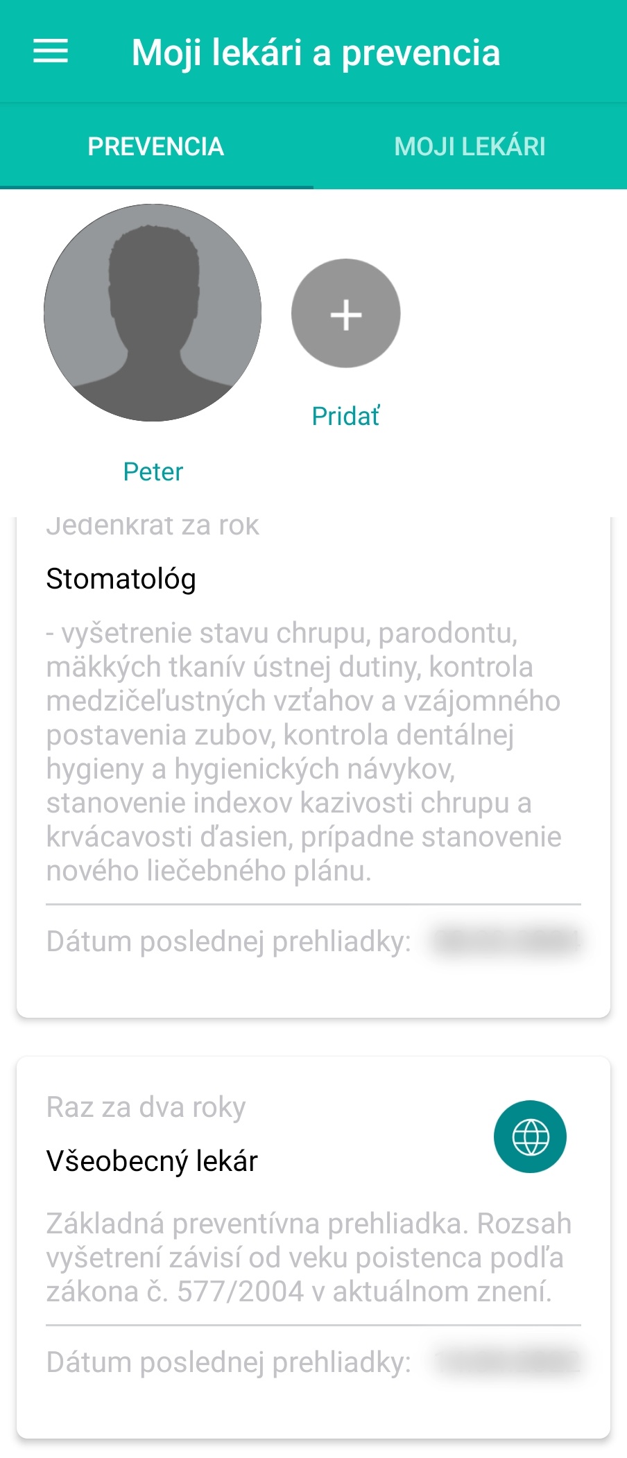 Podstatnou položku sú Moji lekári a prevencia. Tu vidíte údaje o svojom ošetrujúcom lekárovi, absolvovaných prehliadkach a to aj s tým, že tieto prehliadky sa vám budú pripomínať, keď nastane čas ich vykonania. Ide o prehliadky u stomatológa, všeobecného lekára, gynekológa/urológa a pediatra.