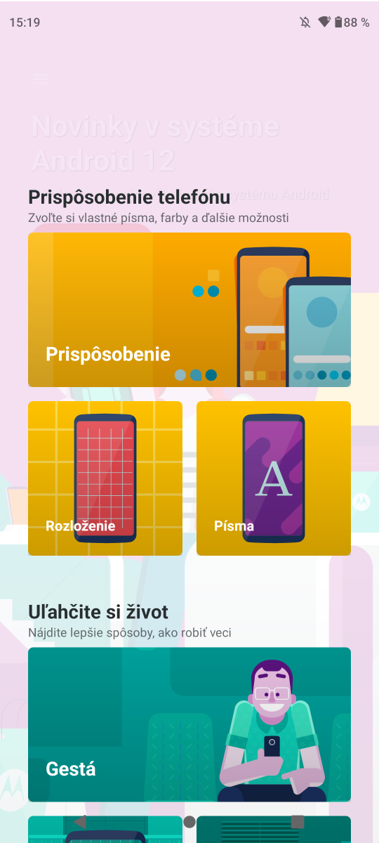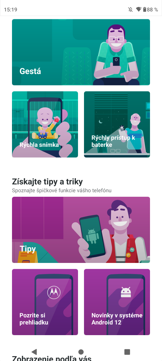 Nie som až taký priaznivec čistého Androidu, ten už ani v motorole nie je tak čistý, ako býval kedysi. Je tu nadstavba My UX, ktorá patrí medzi menej náročným, až minimalistickým a dovolí vám upraviť si vzhľad systému a jeho prvkov. Zostali doplnky Moto, ktoré sú naviazané na snímače telefónu a gestá pri použití telefónu. Je to užitočná vec a rýchlo si na ňu zvyknete.