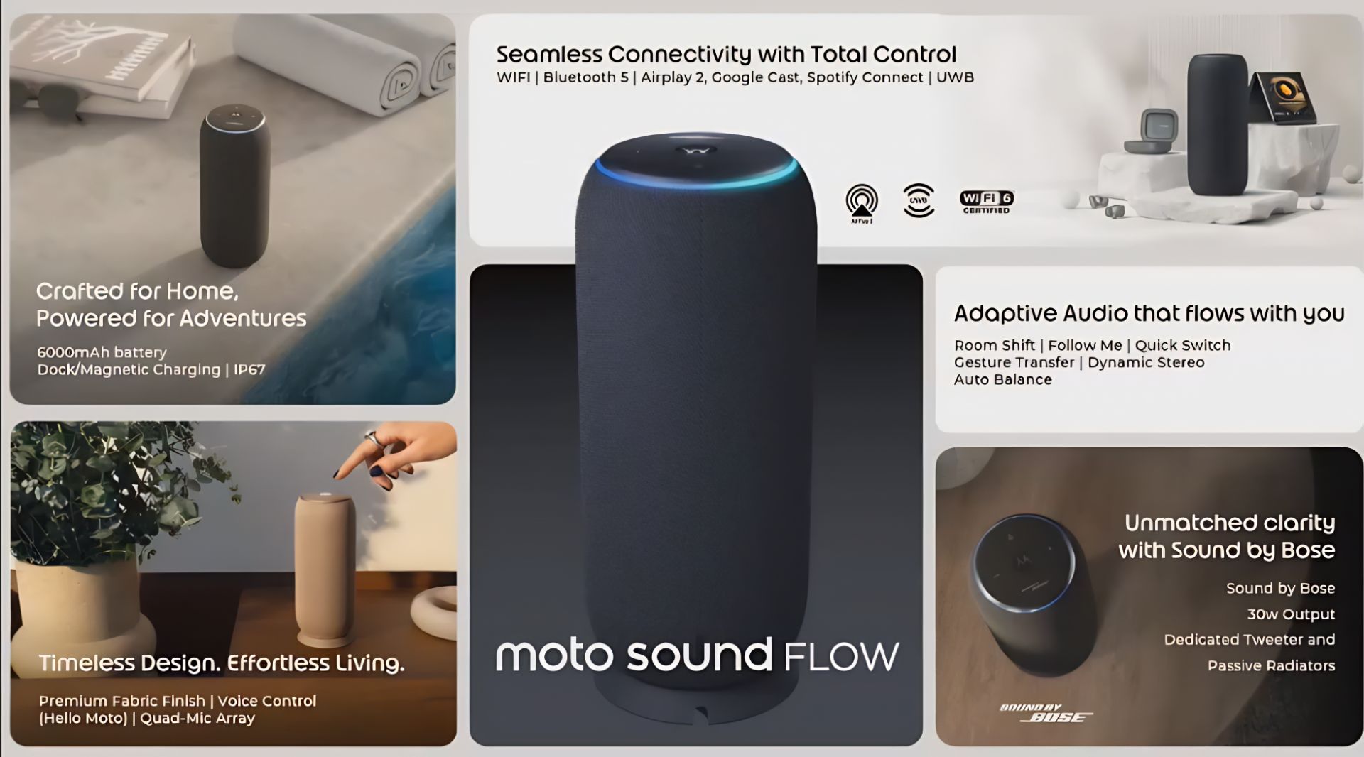 Moto Sound Flow – inteligentný prenosný reproduktor so zvukom ladeným spoločnosťou Bose, výkonom 30 W, Wi-Fi konektivitou a adaptívnym stereo režimom.