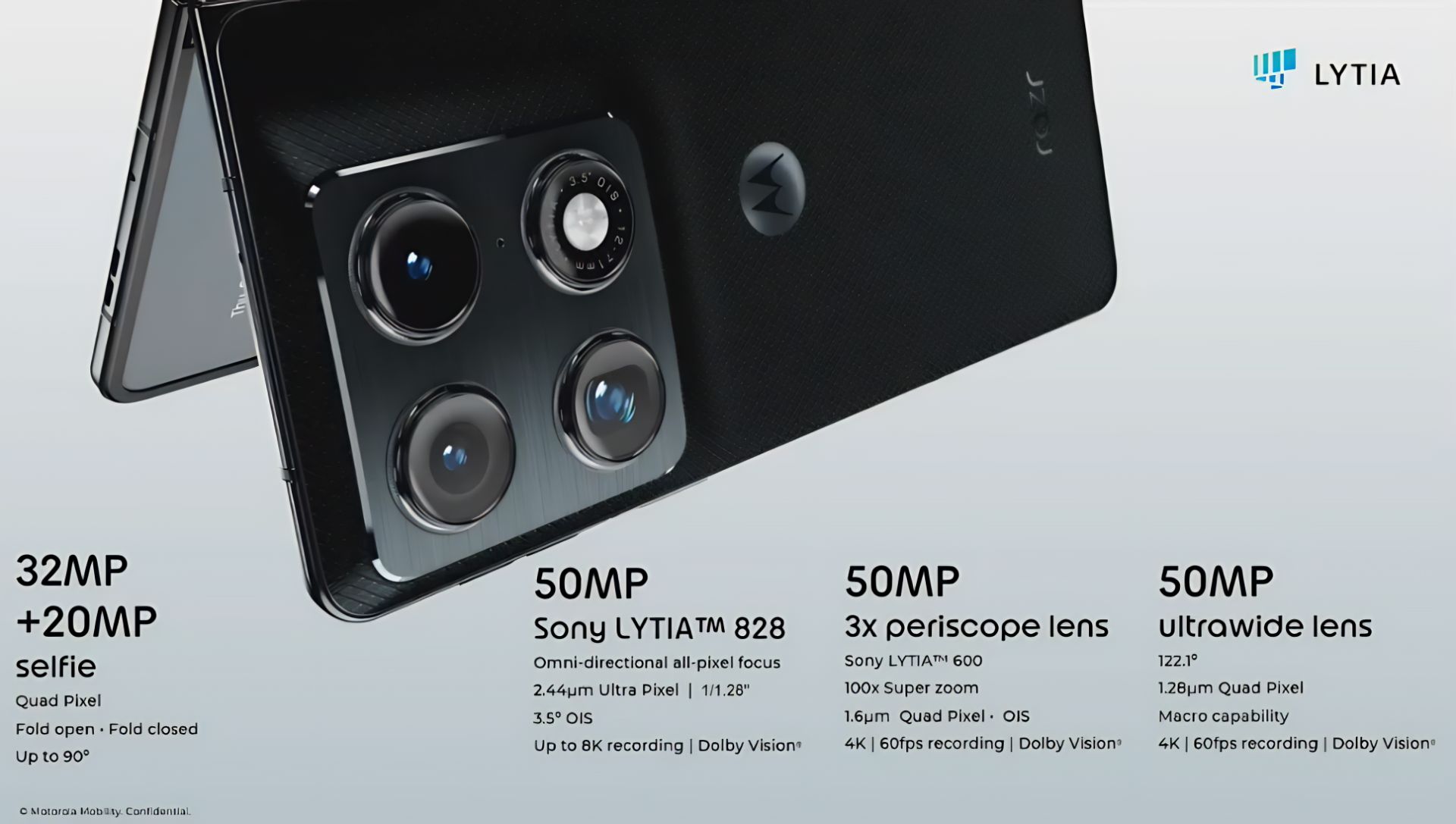 Silnou stránkou tohto smartfónu je aj fotografická výbava. Telefón disponuje štvoricou 50 Mpx fotoaparátov so snímačmi Sony Lytia. Motorola potvrdila, že zariadenie v predbežnom testovaní získalo DXOMark Gold Label, čo ho radí medzi špičku v oblasti mobilnej fotografie. Súčasťou výbavy je periskopický teleobjektív s 3× optickým zoomom (až 100× digitálne), ultraširoký objektív, makro, ale aj 50 Mpx predná kamera s automatickým zaostrovaním.