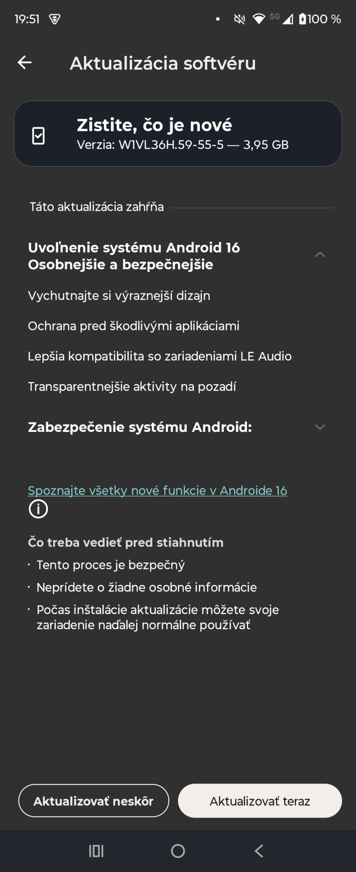 Zoznam hlavných vylepšení vidíte aj na obrázku. Zaujímavosťou je ale spôsob, akým proces prebiehal. Smartfón mal poslednú aktualizáciu spred niekoľkých mesiacov. Potom sa začalo sťahovanie bezpečnostných záplat ešte z minulého roka a až po nich sa začalo sťahovanie takmer 4 GB balíka s novým systémom.