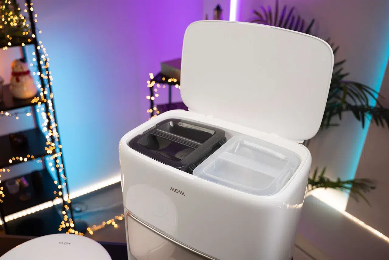 Výbava dokovacej stanice je špičková. MOVA V50 Ultra sa do nej vyprázdni, umyje si kotúče horúcou vodou a vysuší ich horúcim vzduchom. K dispozícii je nádobka na čistiaci prostriedok, ktorý sa využíva na čistenie kotúčov a aj počas samotného mopovania. V tomto smere nemám čo vytknúť, je to špičková výbava.
