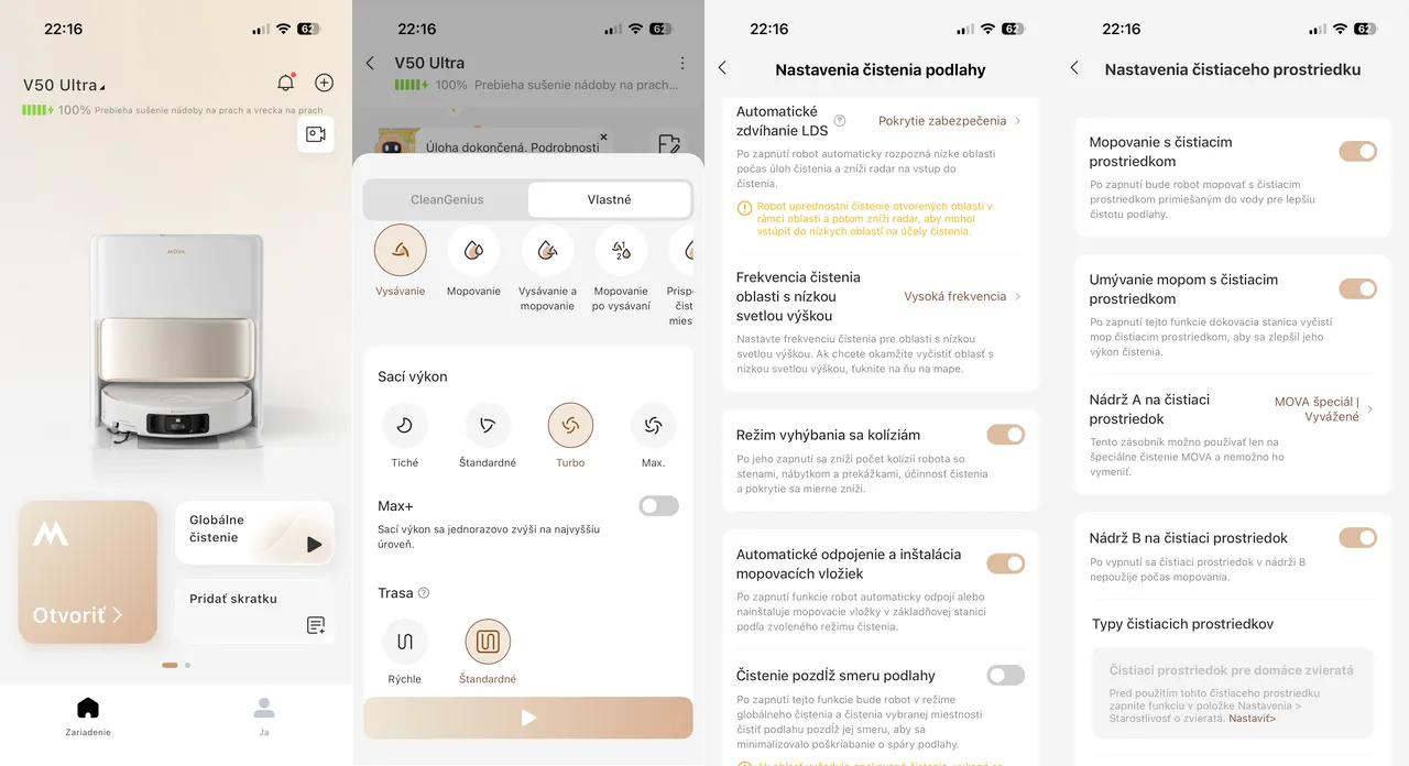 Mobilná aplikácia MOVAhome ponúka slovenskú lokalizáciu. Je to výhoda pre ľudí, ktorí až tak dobre neovládajú angličtinu. Aplikácia ponúka tradičné funkcie. Môžete si nastaviť režimy vysávania alebo mopovania, prípadne kombinovaného vysávania a mopovania. Pre jednotlivé režimy sú k dispozícii viaceré nastavenia výkonu, vlhkosti a hustoty pohybu.