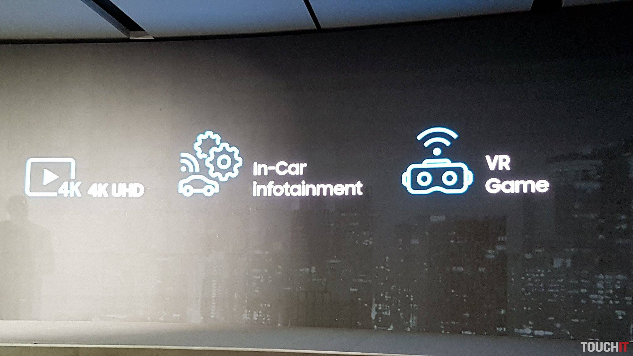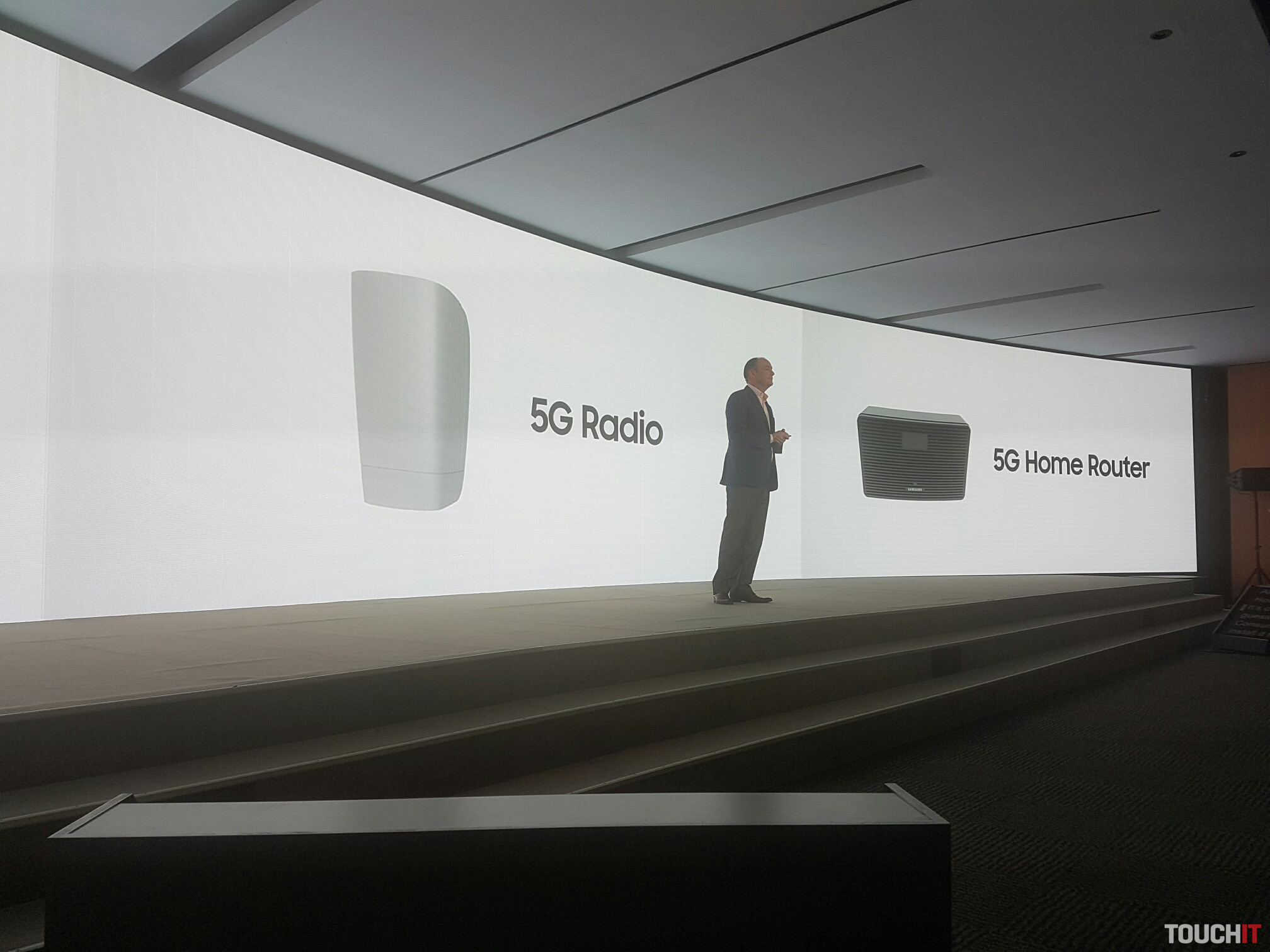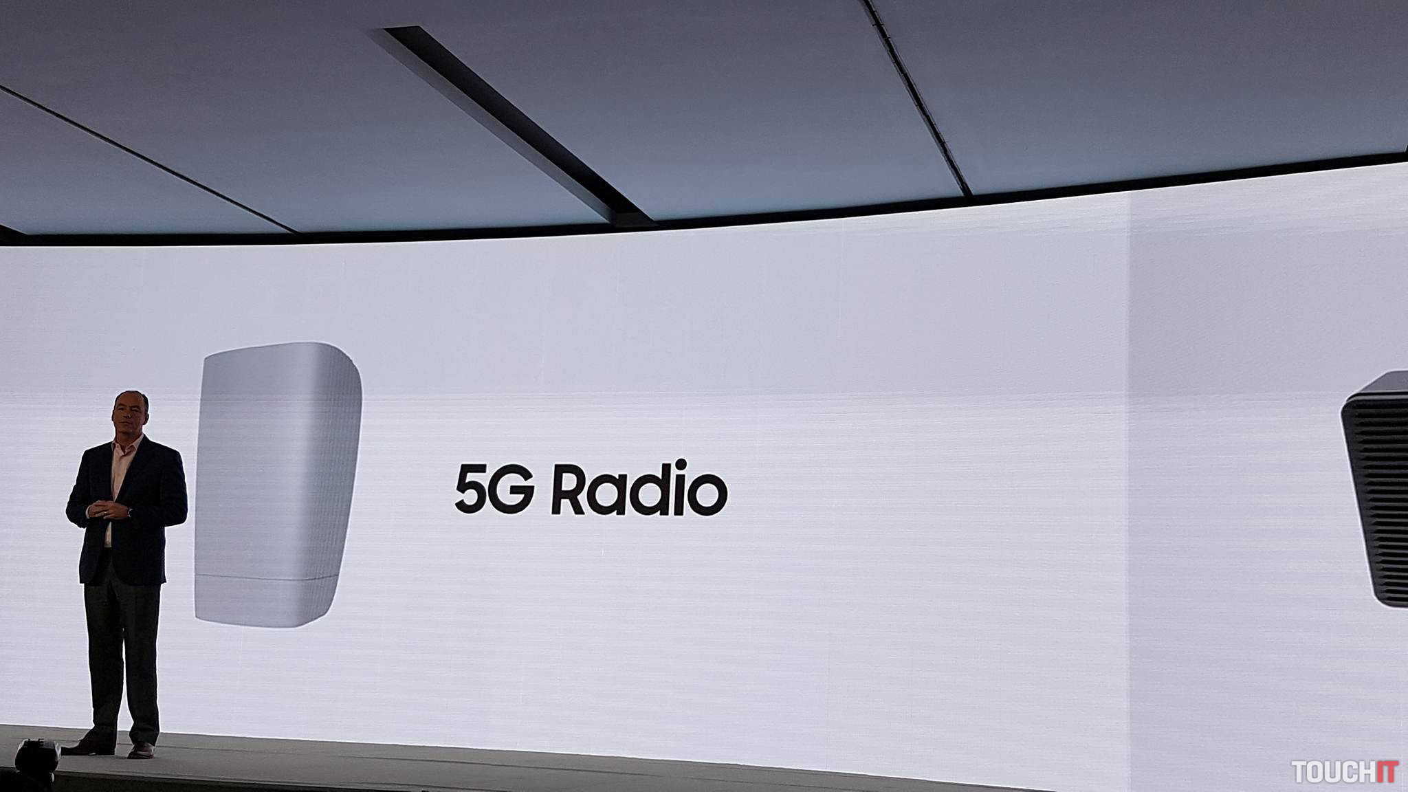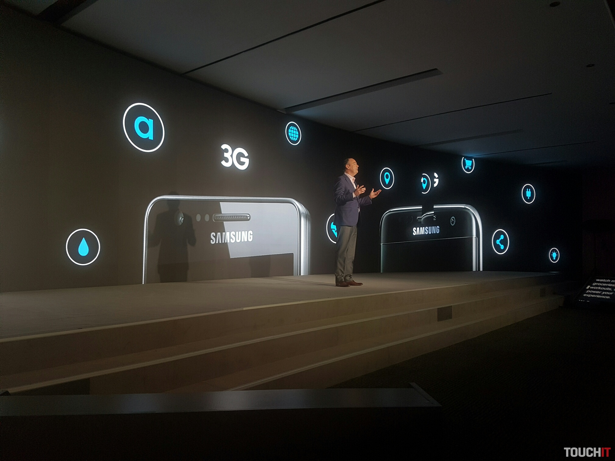 Na pódiu je Tim Baxter a hovorí o internete vecí (IoT), rýchlosti pripojenia a inováciách spoločnosti Samsung. Samsung „verí“ 5G technológii