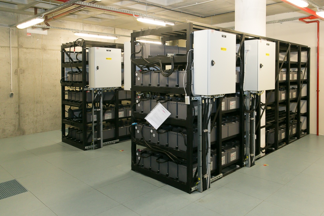 Aby nedošlo k výpadku napájania medzi prerušením externého napájania a nábehom generátora, používa sa systém akumulátorových UPS jednotiek. Tieto jednotky sú samostatné pre každý z priestorov, kde sú umiestnené počítače zákazníkov + jedna jednotka je rezervná (redundancia N+1). Batérie v UPS sa vymieňajú v pravidelných intervaloch. Prevádzku klientskych počítačov tak neovplyvní ani dlhodobý výpadok napájania.