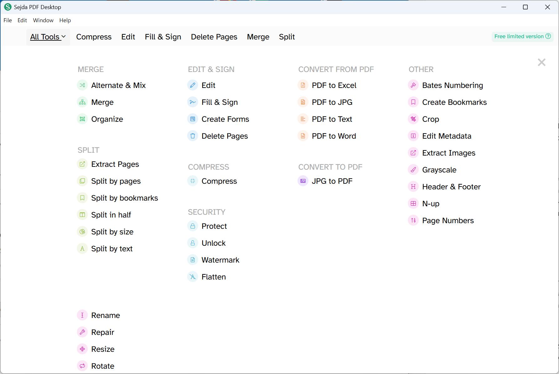 Tu ide skôr komplexný balík nástrojov na prácu s PDF. Je úplne zadarmo ale nie je to priamo softvér na úpravu textu. Má síce funkcie na úpravy, ale v tomto smere je ťažkopádny a nie pri každom PDF dokumente to funguje. Základom je ponuka možnosti, z ktorej si vyberiete, čo chcete z dokumentom urobiť a potom sa spustí konkrétna funkcia. Ich prehľad vidíte na obrázku.
