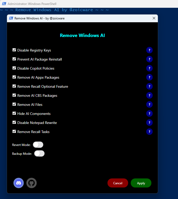 Potrebujete byť pripojení na internet, no zadaním príkazu sa v priebehu niekoľkých sekúnd spustí grafické rozhranie simulujúce bežné okno aplikácie pre Windows. V ňom si môžete vybrať, čo všetko má byť zo systému odstránené alebo vypnuté v spojitosti s AI.