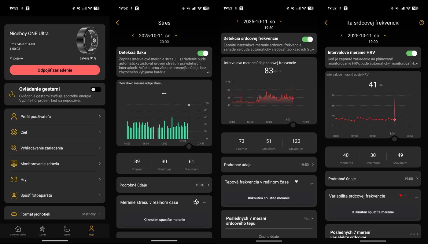 Monitorovanie zdravia pomocou smart prsteňa Niceboy ONE Ultra považujem za základné. Prsteň meria srdcový tep počas celého dňa, pričom si môžete nastaviť interval merania v rozmedzí 5 až 60 minút. Namerané dáta si môžete pozrieť vo forme grafu.