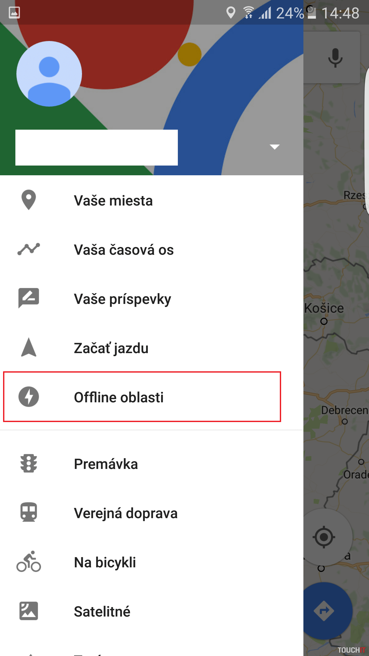 V ľavom hornom rohu je ponuka, v ktorej je položka „offline oblasti“. Tu si môžete jednoducho ukladať oblasti, ktoré potrebujete alebo budete potrebovať. Odporúčame ich sťahovať cez Wi-Fi pripojenie, nakoľko najväčšia možná oblasť na stiahnutie dosahuje objem až 1725 MB.