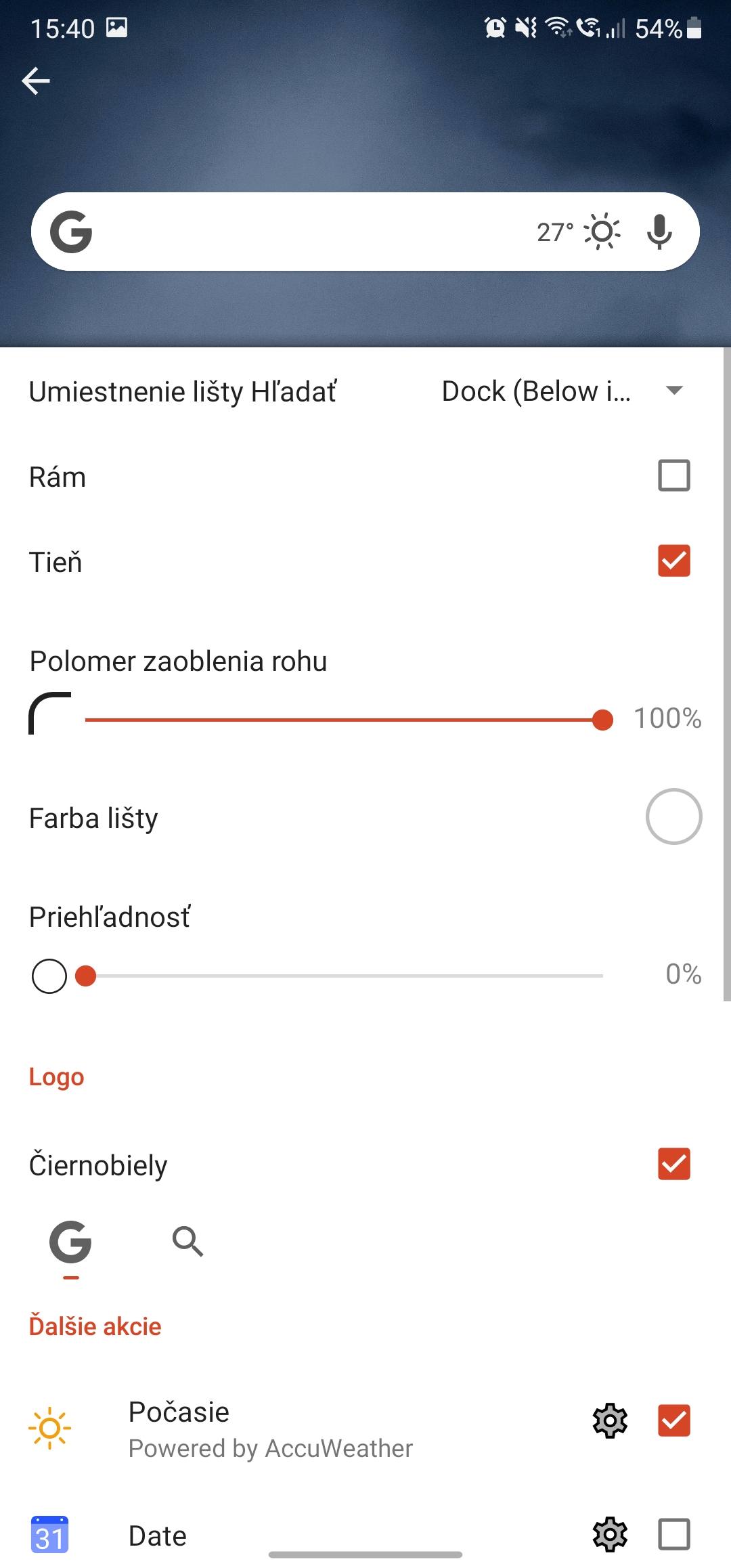 - Ikona počasia na paneli vyhľadávania (Nastavenia Nova > Hľadať > Vyhľadávací pruh na ploche > Počasie)
