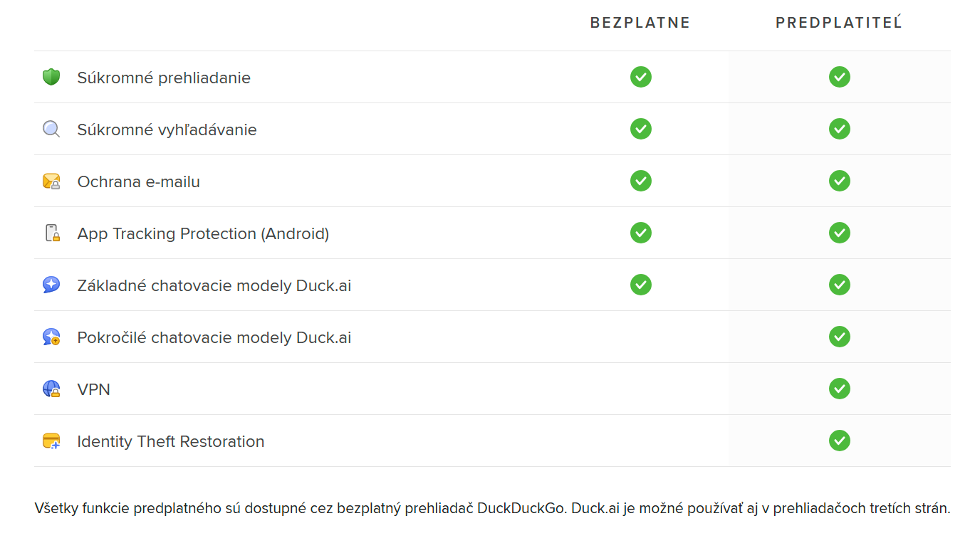 DuckDuckGo stále zostáva zadarmo, a to vrátane použitia AI na stránke Duck.ai. Ponúka súkromné využitie umelej inteligencie, pričom na výber je niekoľko základných modelov. Za predplatné bude možnosť využiť VPN službu a tiež Identity Theft Restoration na pomoc s odcudzenou identitou. Predplatné sa nazýva Privacy Pro.