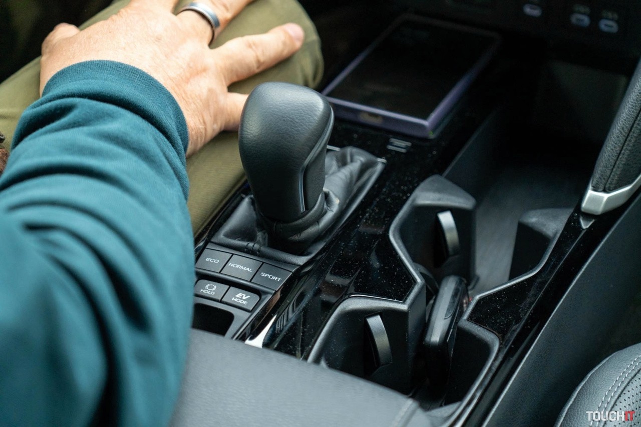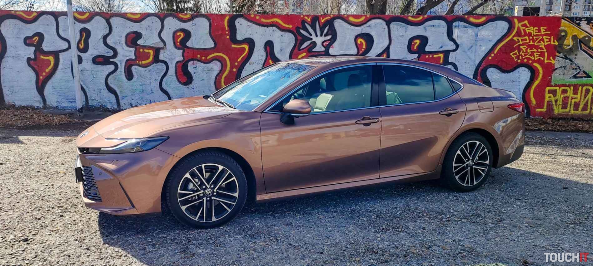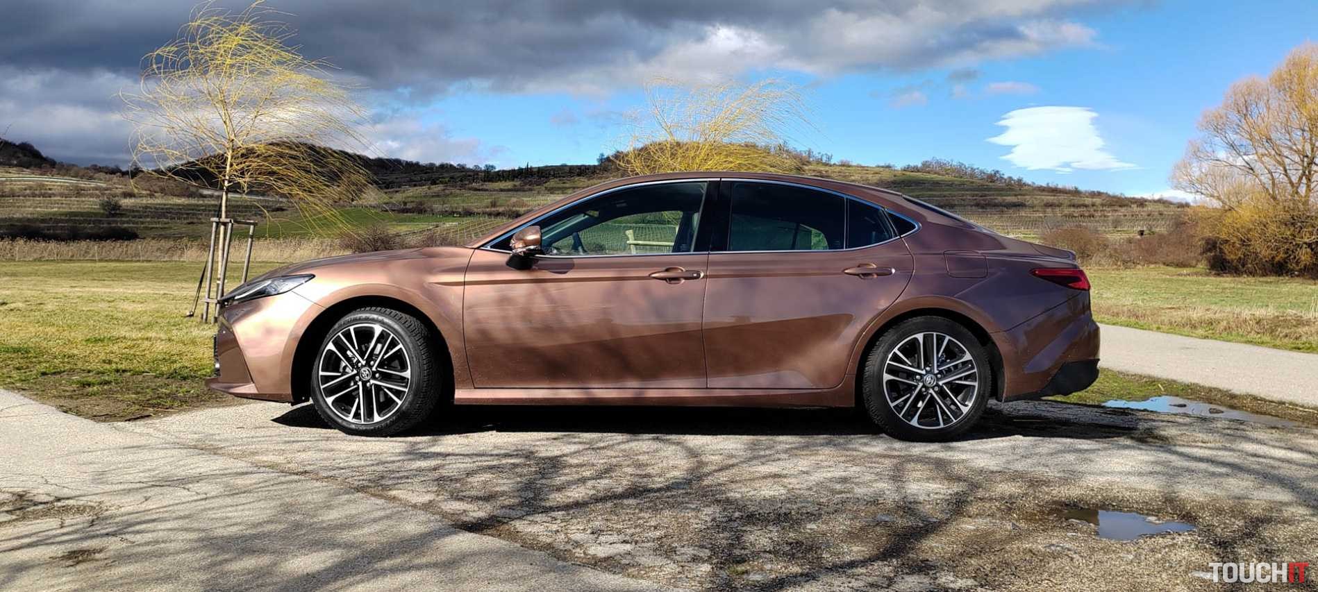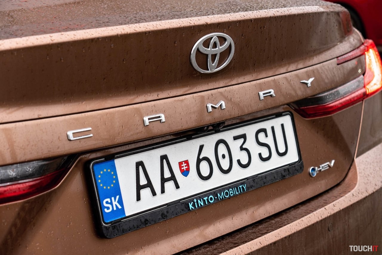 Zadná časť vozidla zaujme svojím dizajnom združených svetiel. Testovaná Toyota Camry využíva hybridnú elektrickú technológiu pohonu piatej generácie.