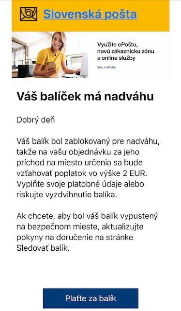 Slovenská pošta pripomína, že nikdy nežiada úhradu žiadnych poplatkov prostredníctvom e-mailov alebo SMS, ani za colné konanie či DPH, ani nesprostredkúva žiadne platby. Klient za zásielku zaplatí buď pri objednávaní tovaru, alebo pri prevzatí zásielky na pošte, kuriérovi alebo v BalíkoBOXe. Rovnako je to aj pri platbe colných poplatkov a dane z pridanej hodnoty – hradíte ich pri prevzatí zásielky.
