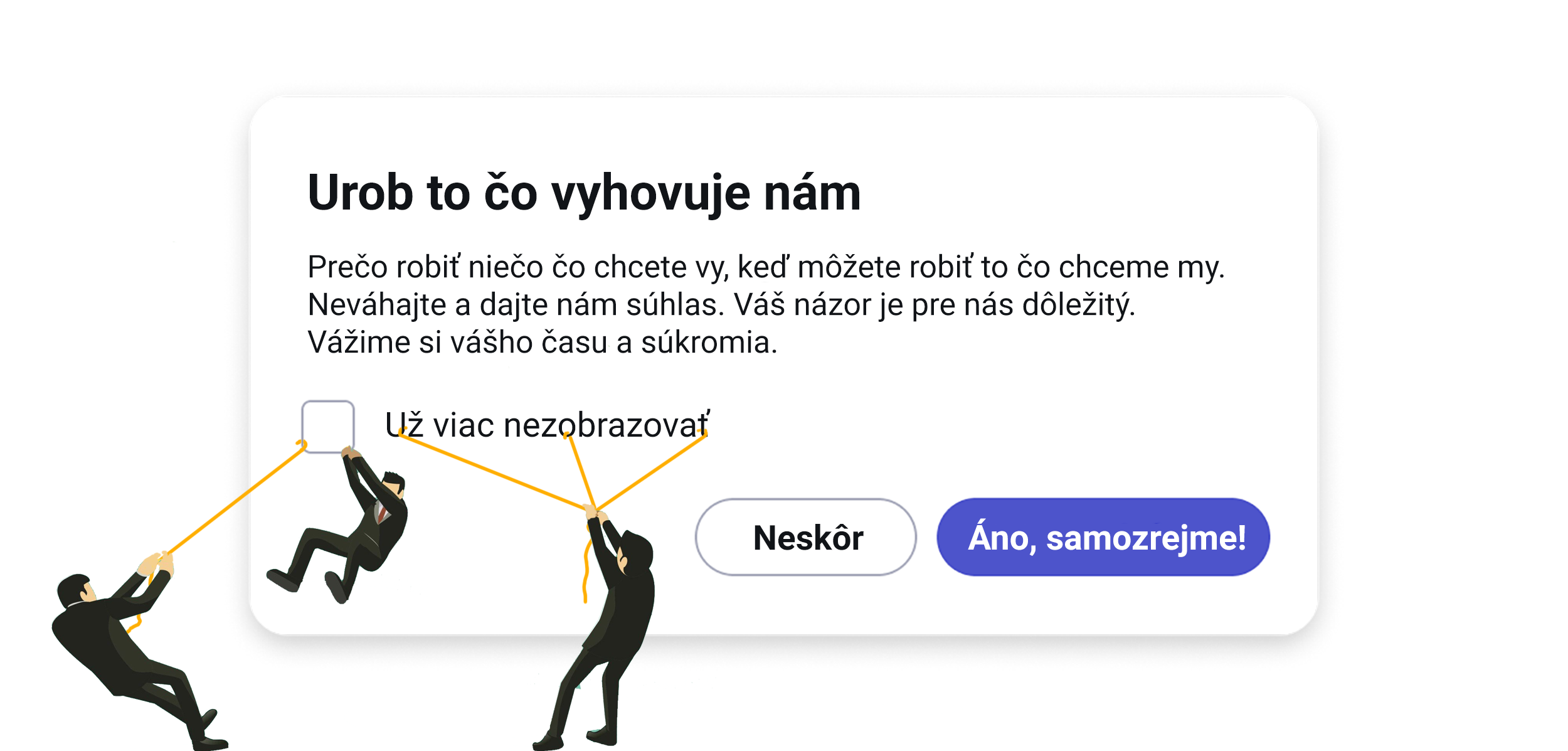 V používateľoch existuje dlhodobo zakorenená a opodstatnená predstava, že softvér, či konkrétne webové aplikácie a služby sú navrhnuté pre ich prospech a slúžia im na čo najlepšie dosiahnutie nejakej činnosti. O to viac sú zaskočení modernými praktikami, pri ktorých sa tieto princípy rúcajú ako domček z kariet.