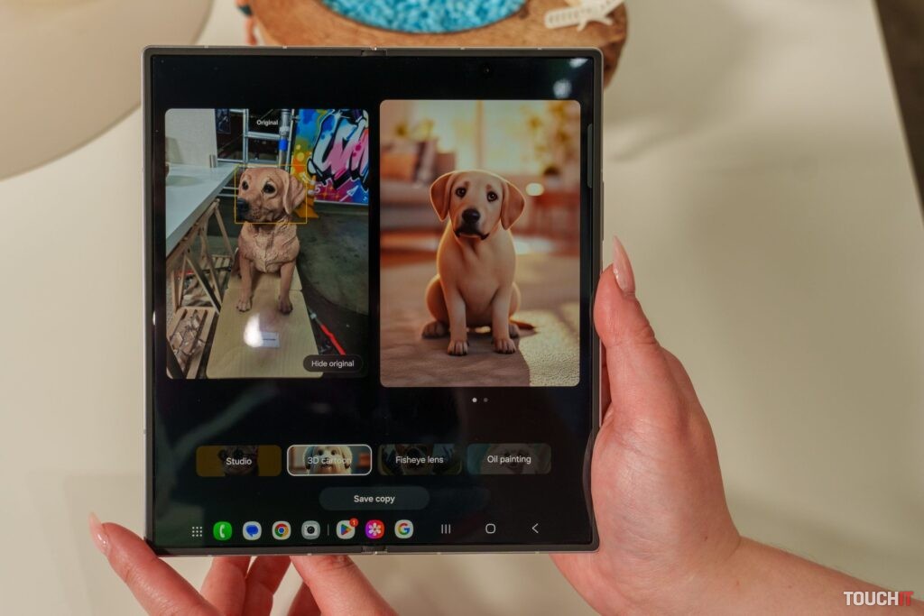 Umelá inteligencia sa v prípade Z Fold7 pohodlnejšie používa – napr. pri poznámkach si do jednej časti jednej časti obrazovky umiestnite pôvodný text, na druhej napr. už len sumár. Podobne je to aj pri úprave fotografie – v jednom okne je pôvodná fotografia a vedľa je už upravená. Rovnako to funguje aj pri portrétovom štúdiu s umelou inteligenciou, ktoré teraz navyše podporuje aj zvieratá.