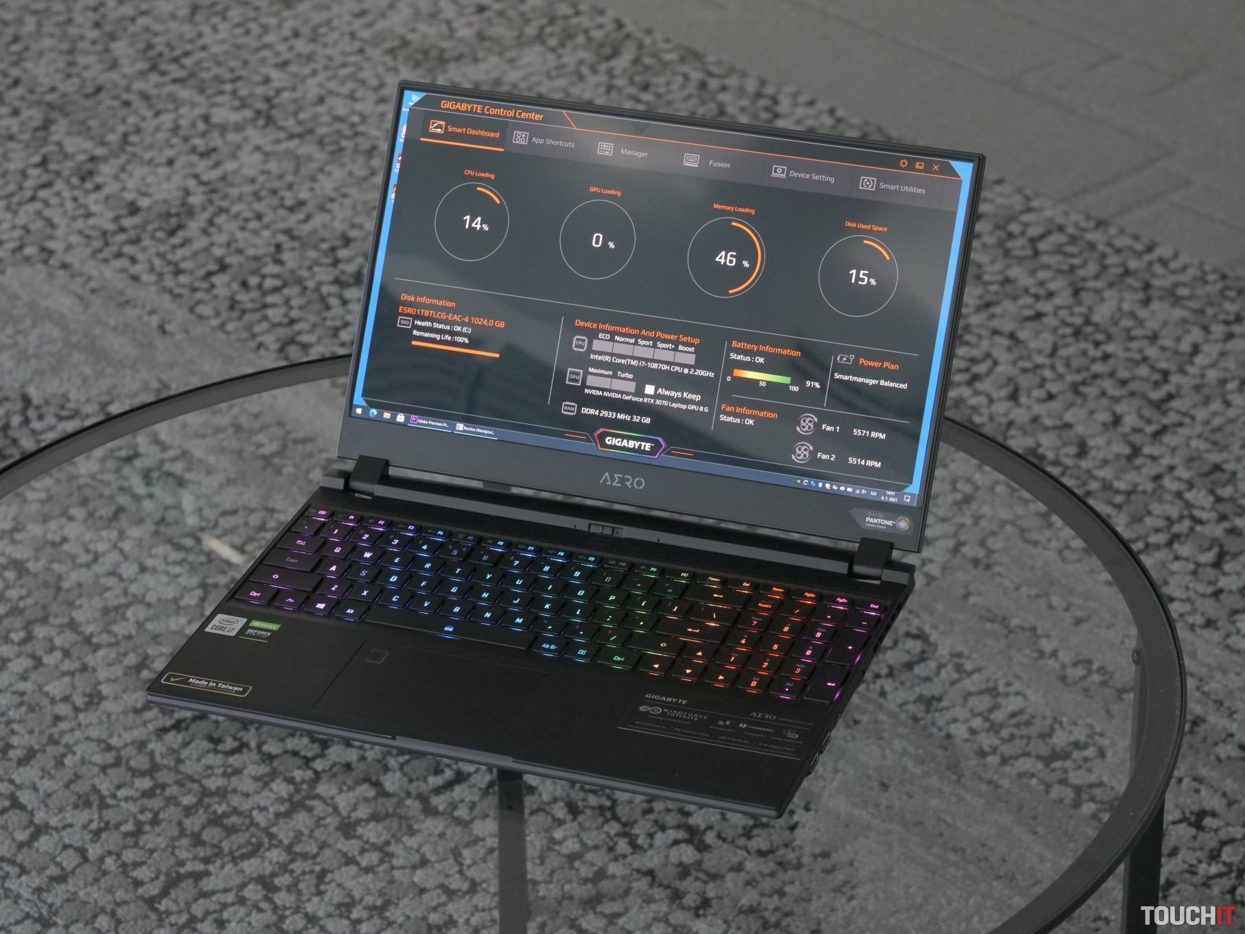Aero 15 je sám o sebe vyladený na náročnú prácu v 3D. Nielen tým, že výrobca použije výkonnú grafiku. Prispôsobil tomu aj dodatočnú výbavu a cez softvér Control Center si nastavíte výkon procesora ako aj výkon grafického čipu. Samostatná klávesová skratka cez Fn je vyhradená super otáčkam ventilátorov, čím behom niekoľko desiatok sekúnd vychladíte notebook.