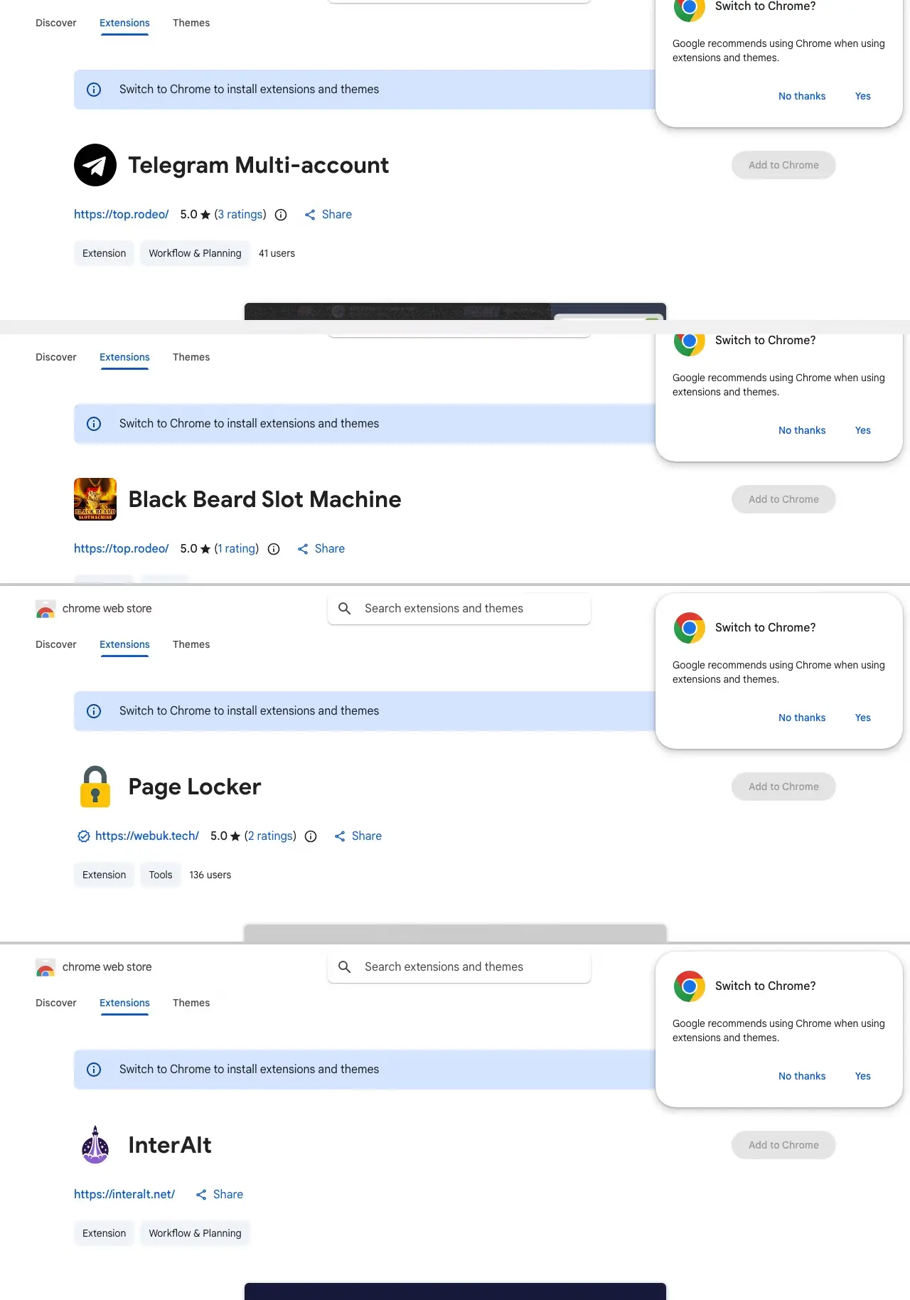 Doplnky sú maskované pod rôznymi vydavateľmi ako Yana Project, GameGen, SideGames, Rodeo Games alebo InterAlt. Až 45 z nich obsahuje zadné vrátka, ktoré pri každom spustení prehliadača komunikujú so vzdialeným serverom. Vďaka tomu môžu útočníci otvárať webové stránky a vkladať kód priamo do rozhrania prehliadača.