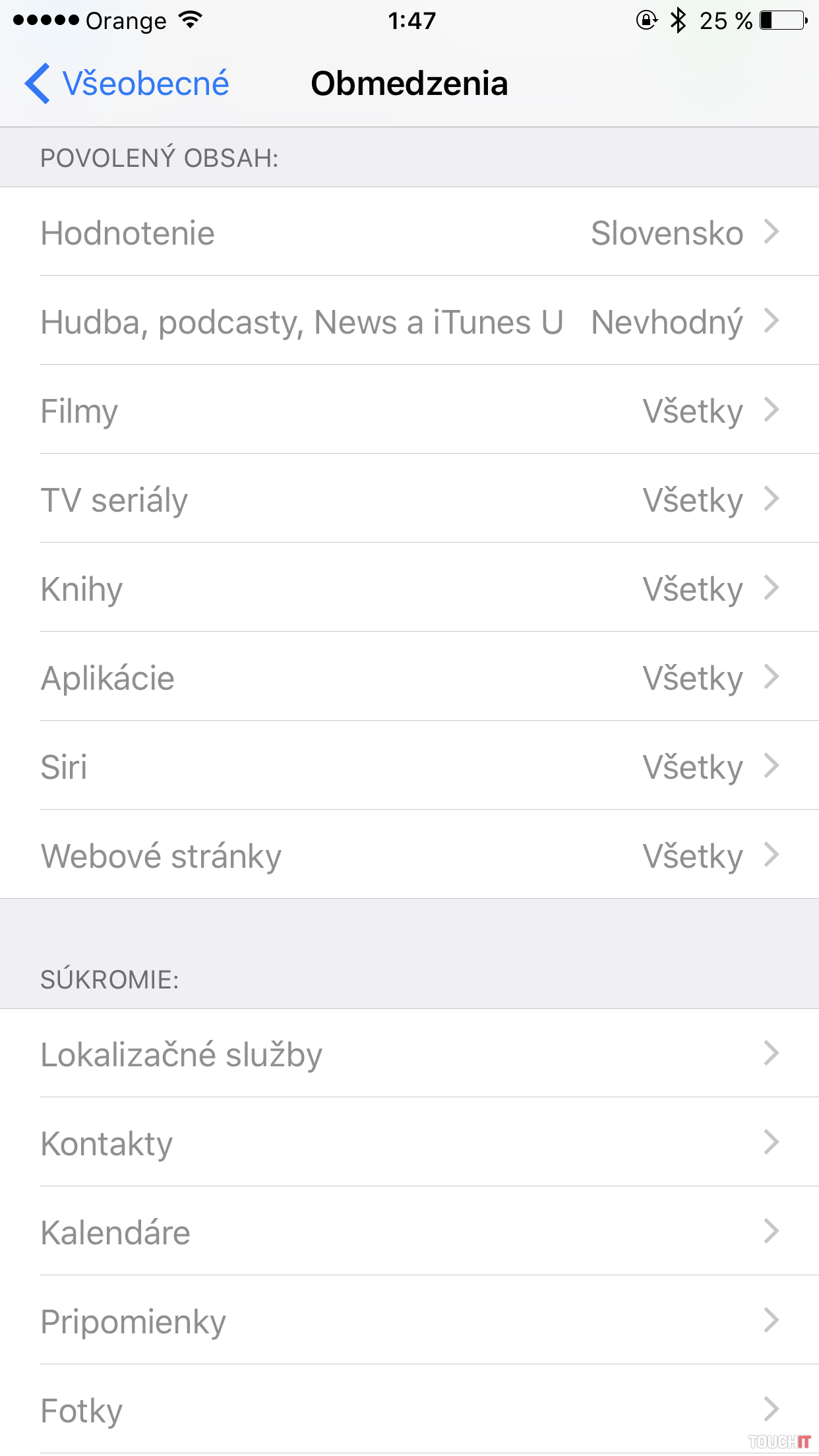 Povolený obsah – tu môžete nastaviť krajiny, z ktorých sa obsah nezobrazí, zakázať prehrávanie videí, hudby, a taktiež ohraničiť vekovú kategóriu obsahu filmov a aplikácií (7 / 12 / 15 / 18 rokov). Nechýba obmedzenie na seriály, knihy a Siri (nevhodné slová). Veľmi užitočnou možnosťou je presné nastavenie prehliadania webových stránok. Tie môžete úplne zakázať, povoliť alebo povoliť len konkrétne – prednastavené alebo vlastné zadanie.