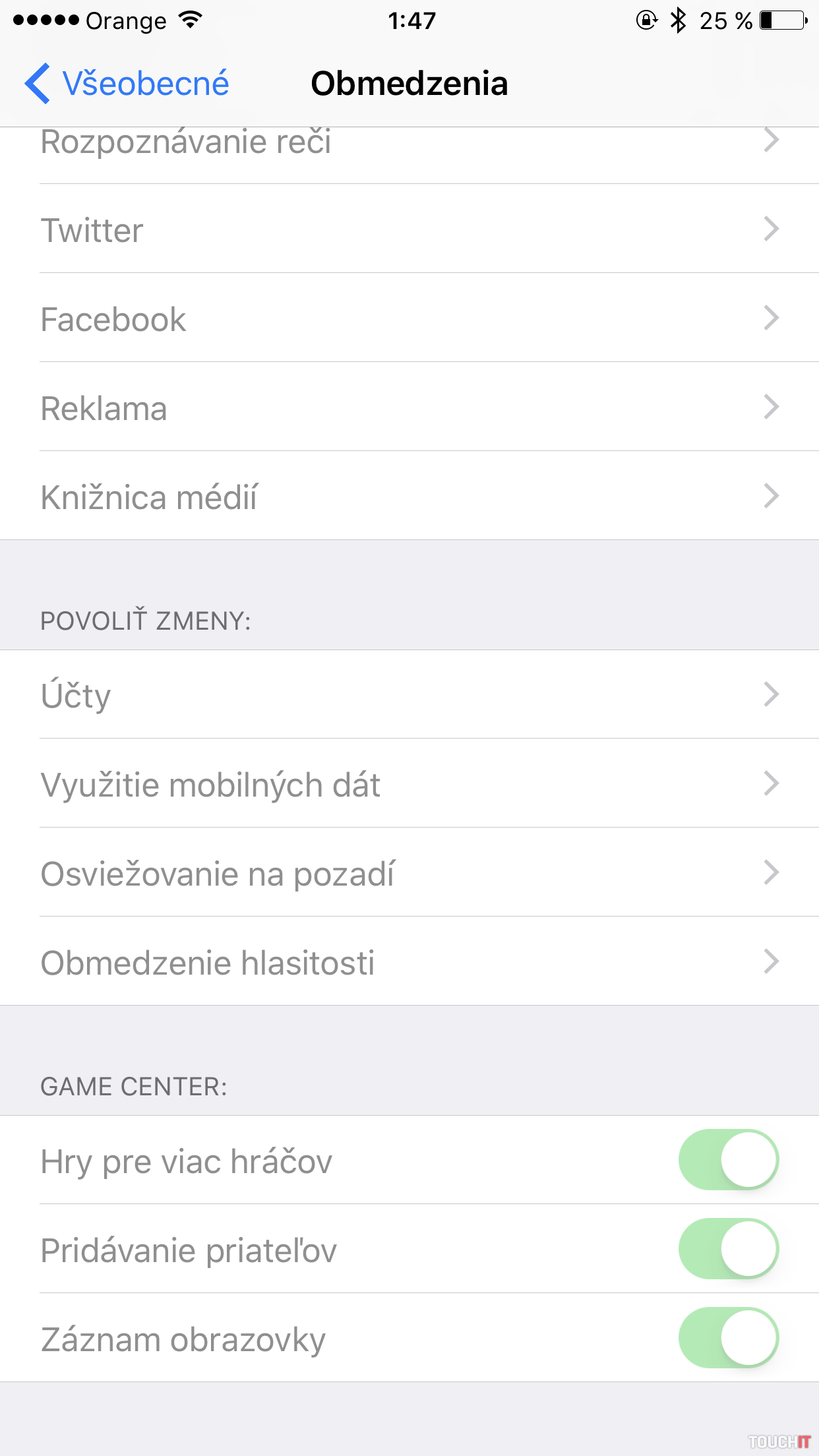 V ostatných odsekoch je možné zakázať/konfigurovať – ovládanie hlasitosti, osviežovanie aplikácii na pozadí, nastavenie Game Center, zákaz hrania hier pre viacero hráčov, pridávanie priateľov a nemožnosť urobiť záznam obrazovky.