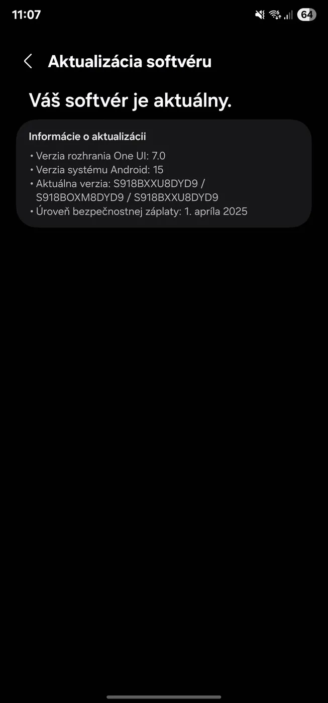 Aktualizáciu sme pravidelne kontrolovali, avšak dostupnosť sa nám zobrazila 28. apríla po 9. hodine. One UI 7 s Androidom 15 pre Galaxy S23 Ultra má úctyhodných 5075,56 MB a obsahuje aj bezpečnostnú záplatu k 1. aprílu 2025.