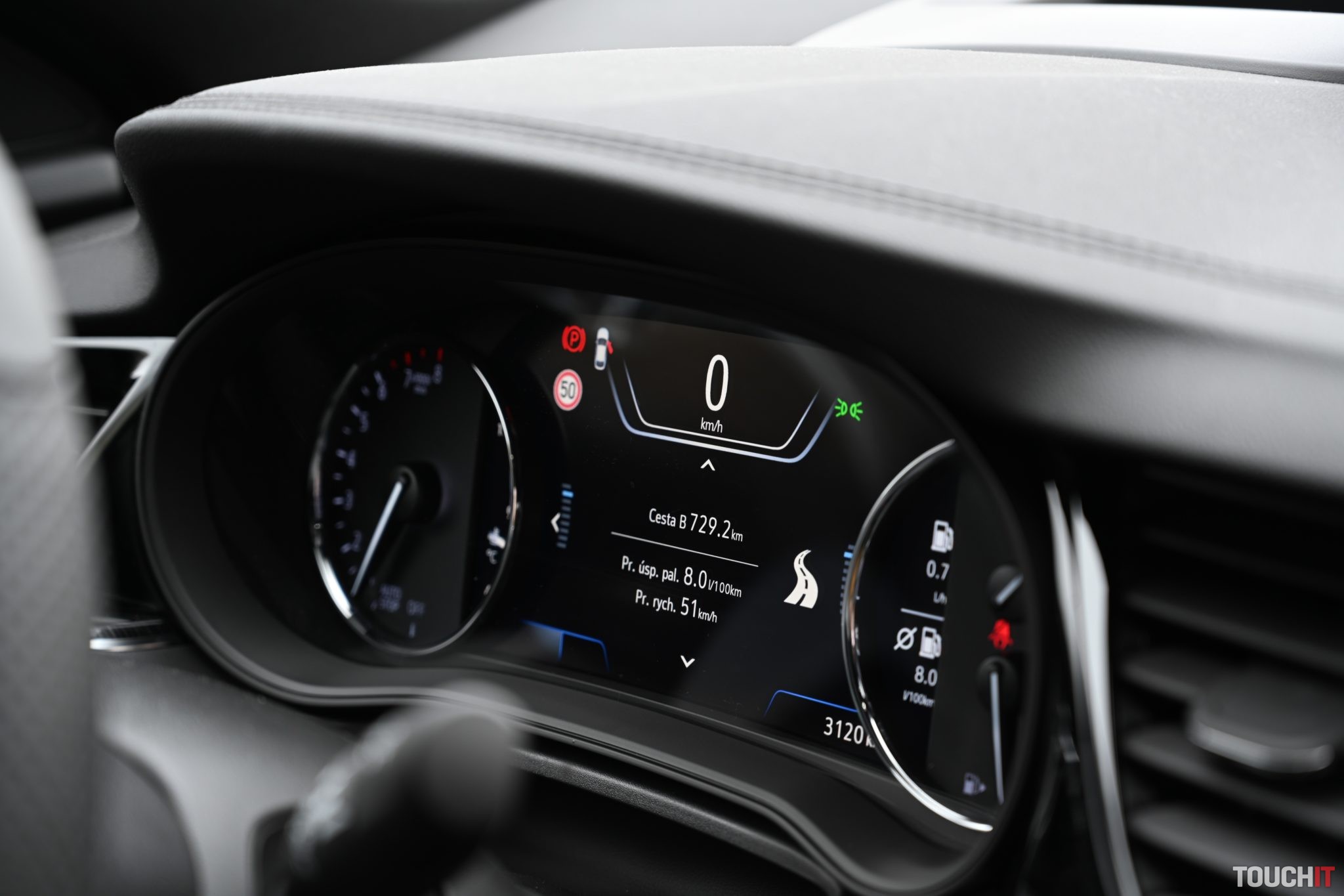 Max. pohodlie zažijete vo dvojici s otvorenou lakťovou opierkou, v ktorej nájdete aj držiaky na nápoje. Samozrejmosťou sú ISOfix úchyty na krajných pozíciách, takže ani rodiny s deťmi nebudú mať problém. Dve sedačky po krajoch a útlejšia mamina do stredu je reálna prax! Zadné sedadlá sú pohodlné, posed trošku hlbší, sedák kratší, ale bez akýchkoľvek útokov na pohodlie pasažierov. Veľmi slušné a priestranné sedenie na každej pozícii, čo bolo pre mňa prekvapením. Väčšina konkurencie v danej triede môže ísť s kľudom a sklopeným zrakom na doučovanie. Dodám, že vzadu je k dispozícii aj výduch ventilácie a 2 nabíjacie USB-A porty. Ešte na sekundu sa vrátim dopredu. Ako som hovoril, ten priestor je veľkorysí! Sedadlá sú výborne spracované, s primeraným bočným vedením a špičkovým posedom. Veľmi rád som si vyvážal, prepáčte za výraz, riť v tomto aute. Elektrické nastavenie a pamäť chýba (v elektrike je iba bedrová opierka), ale za príplatok to mať môžete. Ocenil som aj prevedenie sedadiel, ktoré sú kombináciou vzorovanej látky v strede a kože po krajoch – prešívané bielou niťou. Palubná doska krásne lícuje s výplňami dverí, kde opäť nájdete kožu. Podstatné je to, že orientácia je zameraná na šoféra, čo vidieť najmä na natočení hlavného 8“ displeja v strede palubnej dosky a dôležitých ovládacích prvkoch. Interiér je farebne menej výrazný, ladený do čierna, čo však dodáva istý punc elegancie. Odporúčam nosiť handričku, aby ste mohli dookola utierať veľké lesklé plochy. Som rád aj za fakt, že Opel nenastúpil na módu ovládania výhradne dotykom a zachoval dôležité fyzické ovládacie prvky – klimatizácia, základ audia + asistenti. Pre úplnosť dodám, že kabína je slušne odhlučnená, čo poznať už po pár kilometroch.