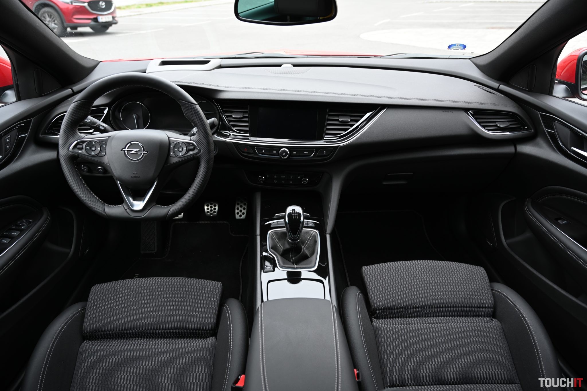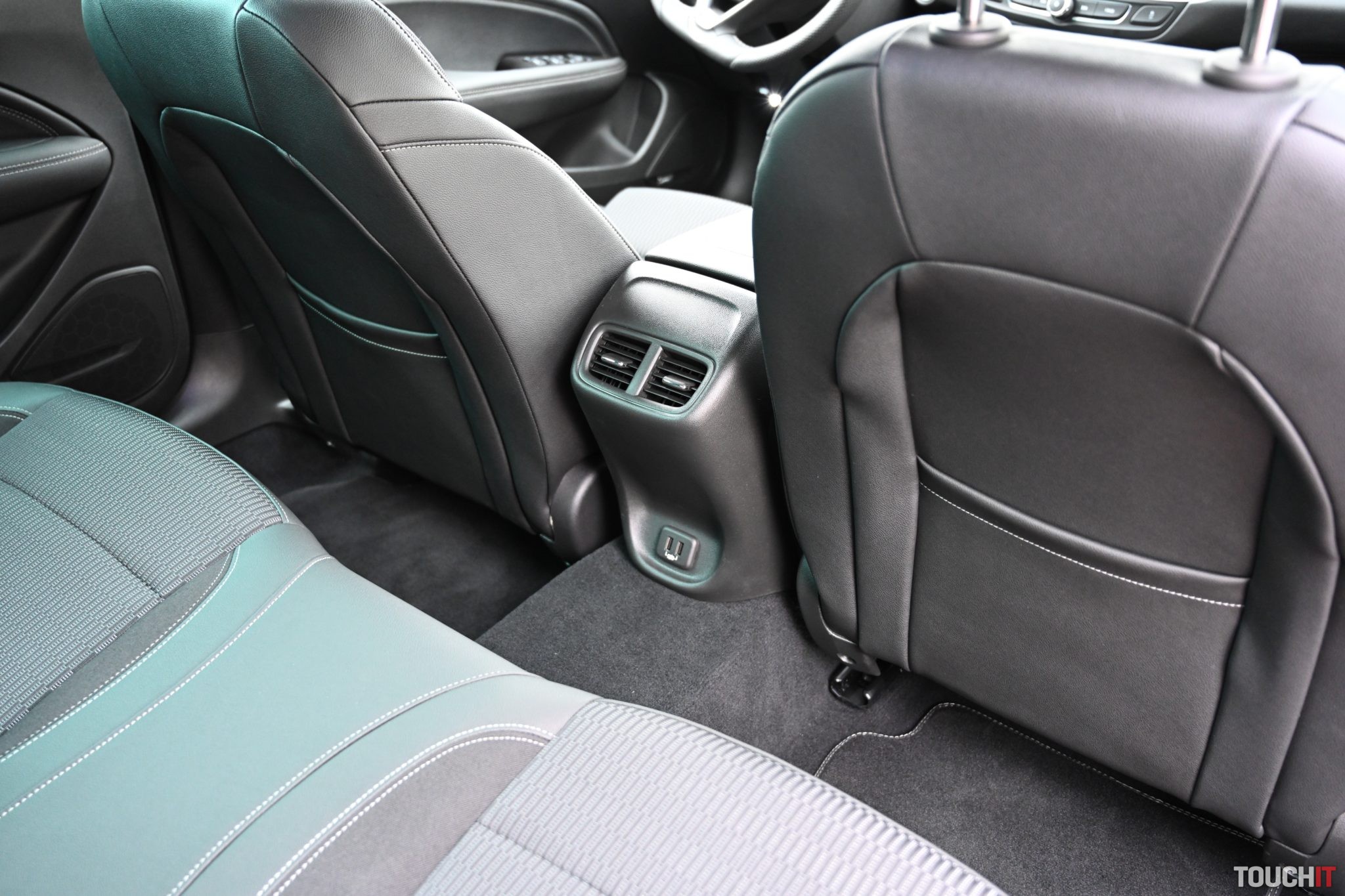 Max. pohodlie zažijete vo dvojici s otvorenou lakťovou opierkou, v ktorej nájdete aj držiaky na nápoje. Samozrejmosťou sú ISOfix úchyty na krajných pozíciách, takže ani rodiny s deťmi nebudú mať problém. Dve sedačky po krajoch a útlejšia mamina do stredu je reálna prax! Zadné sedadlá sú pohodlné, posed trošku hlbší, sedák kratší, ale bez akýchkoľvek útokov na pohodlie pasažierov. Veľmi slušné a priestranné sedenie na každej pozícii, čo bolo pre mňa prekvapením. Väčšina konkurencie v danej triede môže ísť s kľudom a sklopeným zrakom na doučovanie. Dodám, že vzadu je k dispozícii aj výduch ventilácie a 2 nabíjacie USB-A porty. Ešte na sekundu sa vrátim dopredu. Ako som hovoril, ten priestor je veľkorysí! Sedadlá sú výborne spracované, s primeraným bočným vedením a špičkovým posedom. Veľmi rád som si vyvážal, prepáčte za výraz, riť v tomto aute. Elektrické nastavenie a pamäť chýba (v elektrike je iba bedrová opierka), ale za príplatok to mať môžete. Ocenil som aj prevedenie sedadiel, ktoré sú kombináciou vzorovanej látky v strede a kože po krajoch – prešívané bielou niťou. Palubná doska krásne lícuje s výplňami dverí, kde opäť nájdete kožu. Podstatné je to, že orientácia je zameraná na šoféra, čo vidieť najmä na natočení hlavného 8“ displeja v strede palubnej dosky a dôležitých ovládacích prvkoch. Interiér je farebne menej výrazný, ladený do čierna, čo však dodáva istý punc elegancie. Odporúčam nosiť handričku, aby ste mohli dookola utierať veľké lesklé plochy. Som rád aj za fakt, že Opel nenastúpil na módu ovládania výhradne dotykom a zachoval dôležité fyzické ovládacie prvky – klimatizácia, základ audia + asistenti. Pre úplnosť dodám, že kabína je slušne odhlučnená, čo poznať už po pár kilometroch.