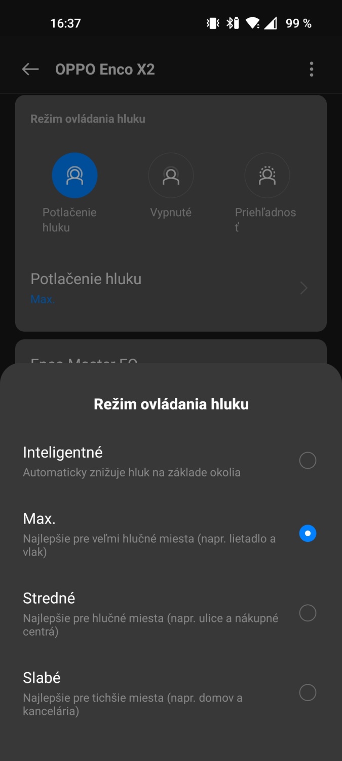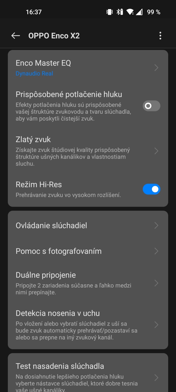 Pri používaní slúchadiel na viacerých telefónoch som si musel zvyknúť na dva spôsoby ovládania. Teda skôr na na dve rozhrania “aplikácie”. V prípade telefónov OPPO/OnePlus sú všetky možnosti nastavenia a ovládania prístupné v zozname Bluetooth zariadení, kde po kliknutí na položku OPPO Enco X2 sa sprístupnia všetky možnosti nastavenia zvuku a ďalších funkcií.