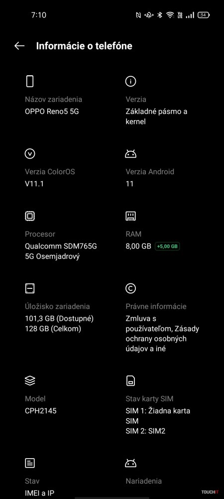 Testovaná verzia Oppo Reno5 5G je vybavená 8 GB pamäte RAM a 128 GB vnútornej pamäte. Kapacitu úložného priestoru síce nerozšírite, ale RAM áno. “Rozšírenie RAM” je funkcia, ktorá na zväčšenie veľkosti použije časť ukladacieho priestoru úložiska. Takto je možné pamäť zväčšiť o 2 až 5 GB. O plynulý chod sa stará Snapdragon 765G, ktorý si poradí aj s náročnejšími úlohami.