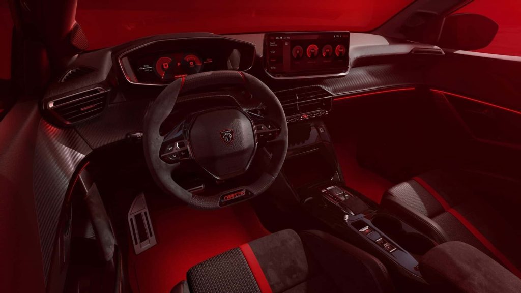V interiéri sa E-208 GTI taktiež odlišuje od svojich skromnejších súrodencov. Prepracované predné sedadlá s integrovanými opierkami hlavy vzdávajú hold modelu 205 GTi 1.9 vďaka červenému pruhu v strede, zatiaľ čo vzor sedadla na pravej strane pripomína model 205 GTi 1.6. Vylepšenia kabíny dopĺňajú aj alcantarové doplnky, špeciálne rohože a červený znak na kompaktnom volante.