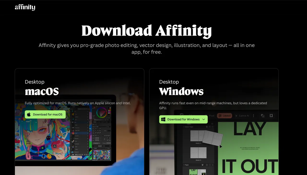 Aplikácia Affinity je dostupná pre Windows a macOS