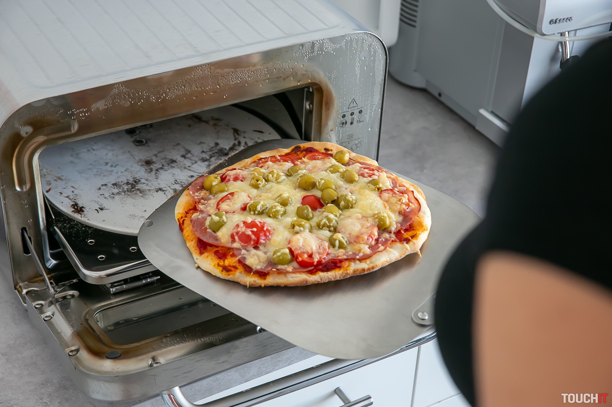 Pec má dvojitú izoláciu a napriek tomu, že vo vnútri môže byť až 400°C, nepopálite sa pri náhodnom dotyku rukou ani počas pečenia. Je tu dvojitá izolácia, ale pec je aj zvonka zahriata. Tiež cítiť, že niečo pečiete a pri našej príprave sa do kuchynky zbehlo celé naše poschodie. Pizzu môžete počas pečenia sledovať cez presklenené okienko. Do tejto pece môžete pritom umiestniť pizzu do priemeru 300 mm a má príkon 2100 W. Po skončení pečenia počítajte tak s 20 až 60 minútami na jej chladnutie pri otvorených dvierkach podľa tohto, akú teplotu ste ju zahriali. Po skončení pečenia by ste mali vyčistiť kamennú podložku na pečenie, prípadne aj panvicu s vysokými bokmi.