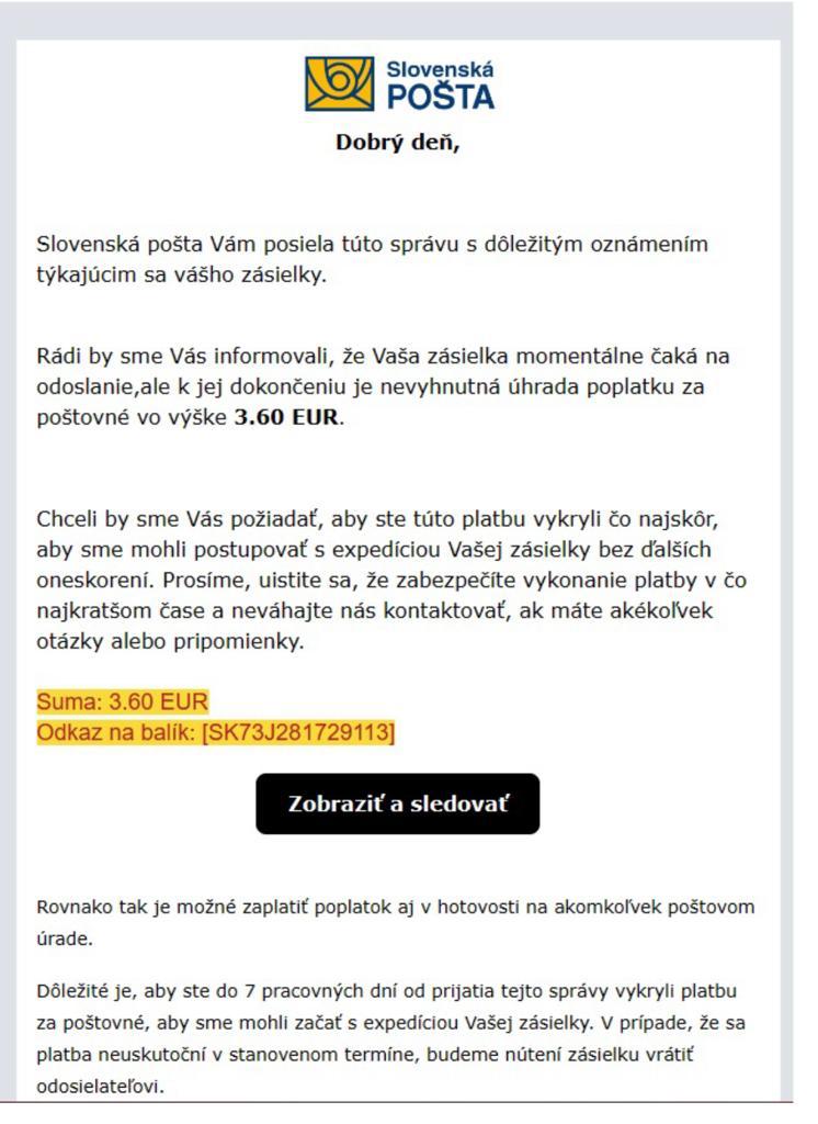 Slovenská pošta zaznamenala približne 60 rôznych typov podvodných správ (SMS, MMS, e-maily, telefonáty či sociálne siete), ktoré sa tvária ako od pošty. Adresáta vyzývajú k úhrade platieb za doručenie zásielky, k zmene doručenia či uloženia zásielky, na zaplatenie colných poplatkov, na údajné vytvorenie objednávky na poštového kuriéra, ktorý má zásielku vyzdvihnúť a cez stránku pošty majú byť preposlané peniaze. Toto sú ukážky falošných správ a mailov: