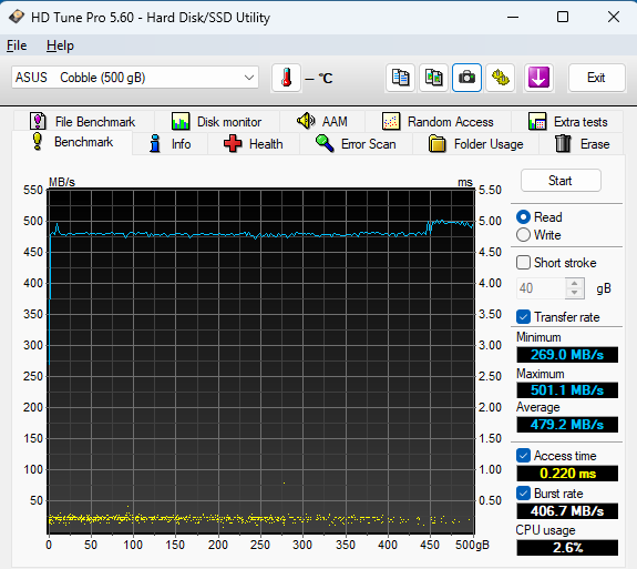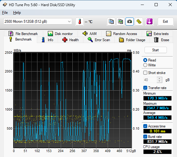 Na notebooku s novým AI procesorom, ktorý má podozrivo pomalý nábeh systému, ukázali testy príčinu práve v NVMe disku Micron 2500. V hraničných hodnotách síce dosiahne maximálnu rýchlosť cez 2300 MB/s, no priemerná rýchlosť klesne na približne 950 MB/s. To ale platí len pri sekvenčnom čítaní – práca s malým počtom niekoľko GB súborov. Toto je prípad disku Micron 2500 s kapacitou 512 GB.