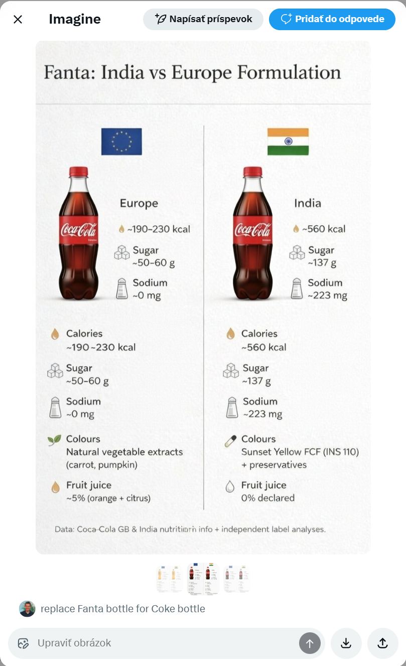 Stačí zobraziť obrázok vo vlákne na X, ťuknúť na tlačidlo Upraviť obrázok a zadaním príkazu ho upravíte a môžete šíriť ďalej pozmenený cez AI. (Vľavo originál, vpravo AI nahradila Fantu Colou.