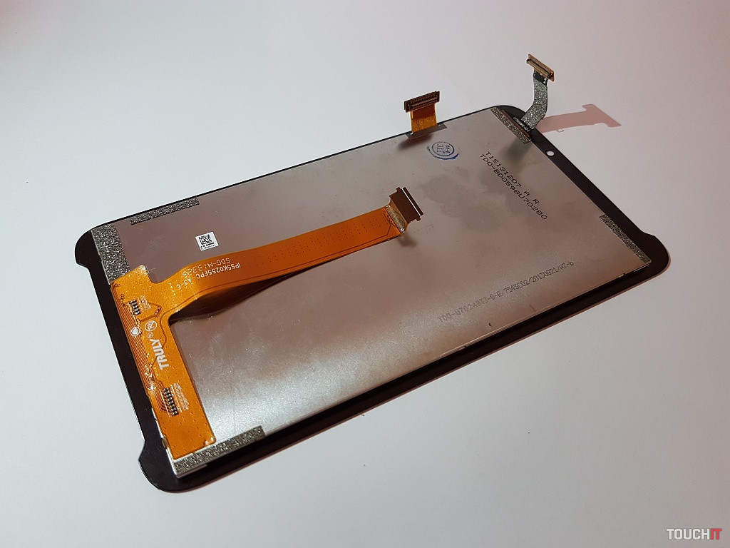 Na rad prichádza odpojenie batérie, LCD displeja a sekundárnej dosky. Prvá fotografia ukazuje z ľavej strany konektor batérie, konektor prepojenia sekundárnej dosky so základnou a posledný je jeden z konektorov LCD displeja. Snímka vpravo ukazuje dva flex káble a konektory LCD displeja. Displej má celkovo tri pripojenia k základnej doske, čo je nezvyčajné rozdelenie.